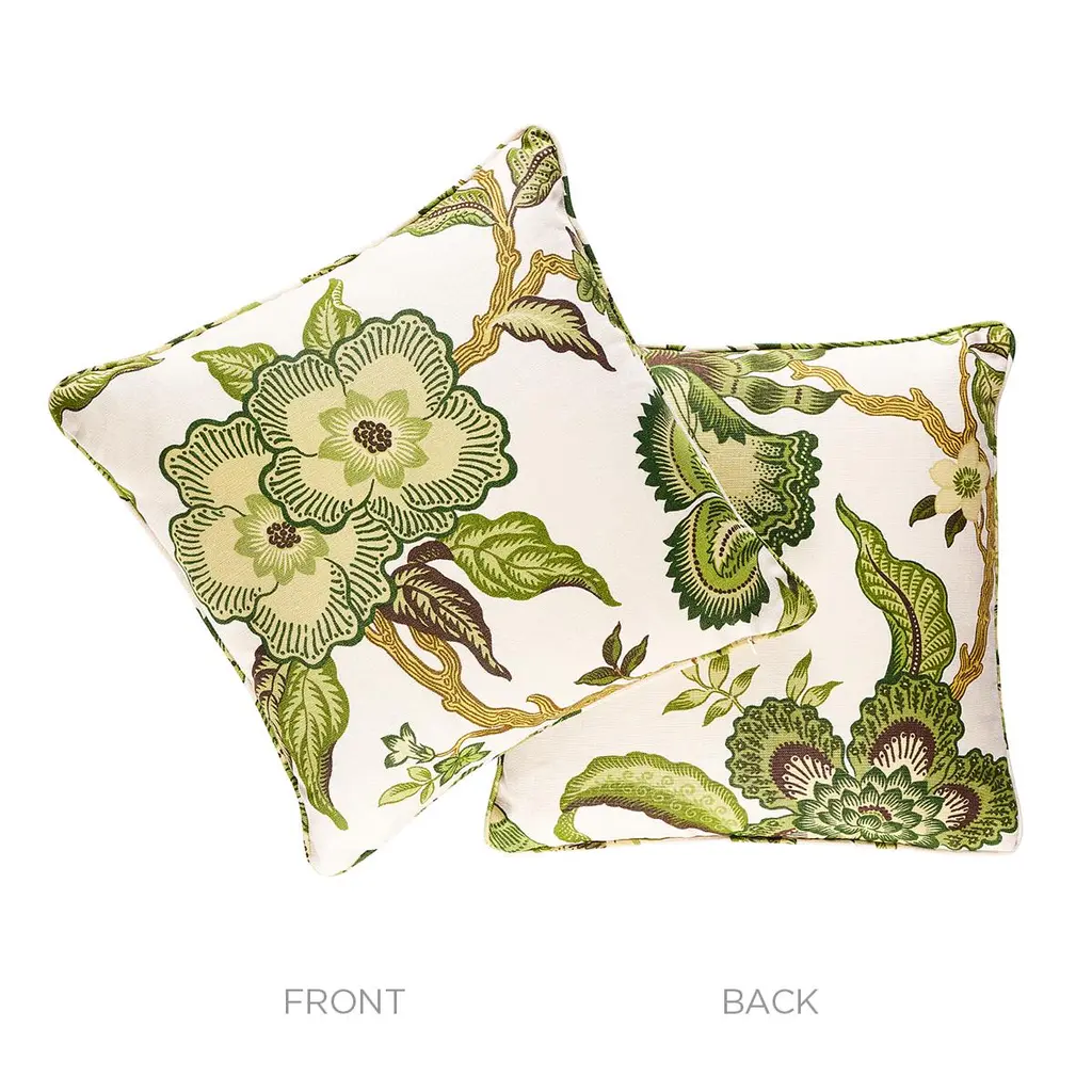 This pillow features Hothouse Flowers by Celerie Kemble for Schumacher with a self welt finish. A classic tree of life pattern with a twist. The dramatically scaled print combines stylized exotic motifs with an au courant palette. Pillow includes a feather/down fill insert and hidden zip closure.