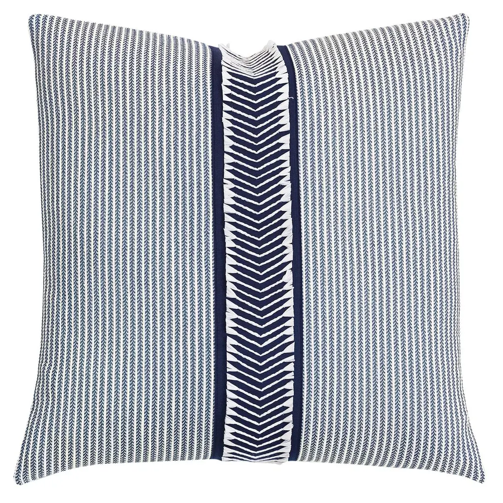 This pillow features Jessie Cut Velvet by Victor Glemaud for Schumacher with a knife edge finish. Created in collaboration with Haitian American fashion designer Victor Glemaud, Jessie Cut Velvet in navy & white is a stylish offset chevron design that works beautifully for upholstery and pillows. This alluring cut velvet, with its silky pile and crisp, contrasting cotton ground, has fabulous texture and endless appeal. Pillow includes a feather/down fill insert and hidden zip closure.