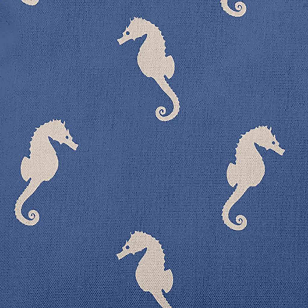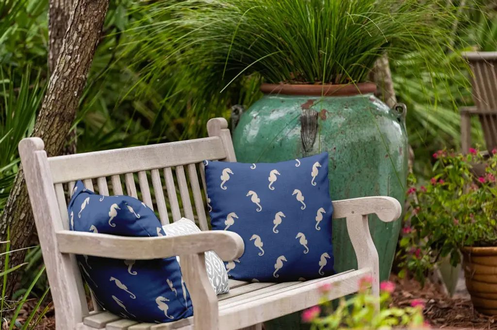 Bring the Seaside to your home decor with the Sea Horses Pillow from our Nautical Nights Collection. This indoor/outdoor pillow will add a coastal vibe to your porch, deck or patio! This decorative pillow is printed on both sides and crafted with a soft, durable polyester exterior, and filled with down alternative for a crisp look and a comfortable sitting experience. The fabric is resistant to weather, mold, and mildew so you can accentuate your indoor or outdoor decor. It is sewn closed with a knife edge and can be easily spot cleaned or dry cleaned. With the designs in this collection, you will bask in the natural beauty of the shore throughout your home.