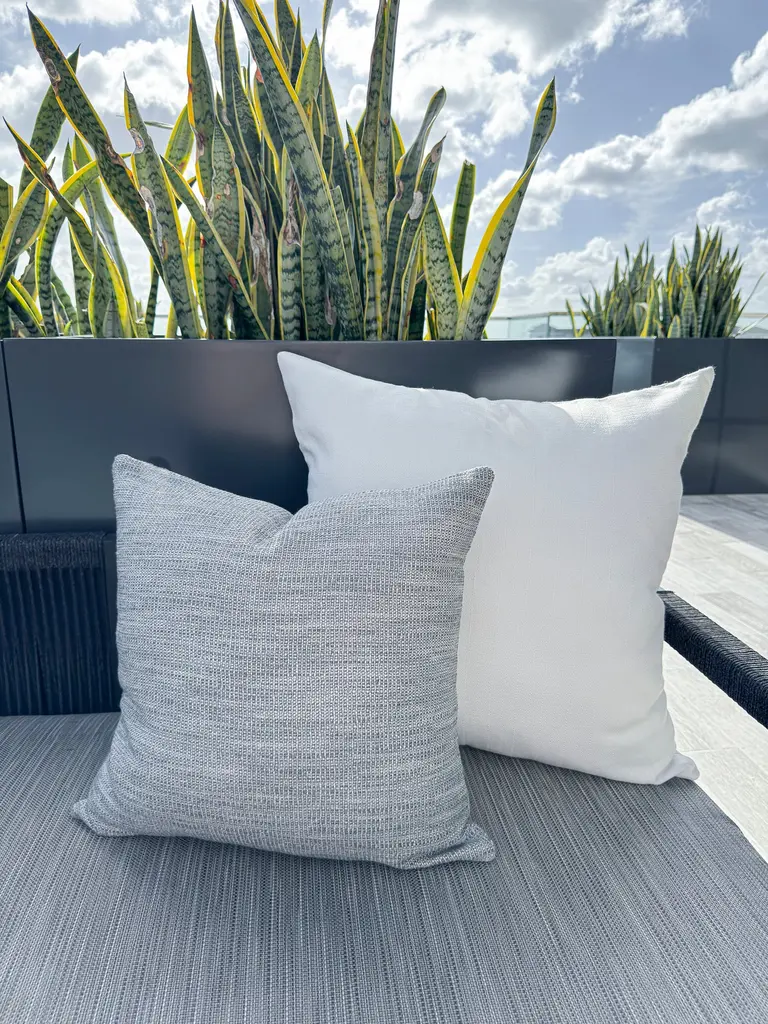 Introducing the Seaside Smooth Grey Indoor Outdoor Pillow, a soft and durable Acrylic fabric made with a unique technology that withstands tough weather conditions for many years to come. The Anaya Pure Air Collection features Indoor and Outdoor Pillows which are cut and sewn in our Miami, FL facility. PureAir Technology: Very soft Acrylic fabric suitable for Indoor or Outdoor use, UV-resistant, Quick-dry, 5-year Warranty. Color: Grey. Size: 14"x20", 20"x20", 24"x24" Fabric: Soft 100% Solution Dyed Acrylic. Insert: 100% Polyester. Wash Instructions: Spot Clean or Machine Wash on Delicate using Cold Water only, Hang to Dry. Closure: Zipper on bottom edge. Made in the USA.