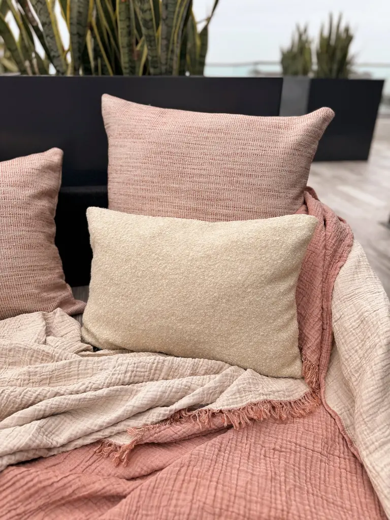 Introducing the Seaside Smooth Red Indoor Outdoor Pillow 20x20, a soft and durable Acrylic fabric made with a unique technology that withstands tough weather conditions for many years to come. The Anaya Pure Air Collection features Indoor and Outdoor Pillows which are cut and sewn in our Miami, FL facility. PureAir Technology: Very soft Acrylic fabric suitable for Indoor or Outdoor use, UV-resistant, Quick-dry, 5-year Warranty. Color: Red. Pattern: Red woven pattern with Beige Ground color. Size: 20"x20". Fabric: Soft 100% Solution Dyed Acrylic. Insert: 100% Polyester. Wash Instructions: Spot Clean or Machine Wash on Delicate using Cold Water only, Hang to Dry. Closure: Zipper on bottom edge. Made in the USA.