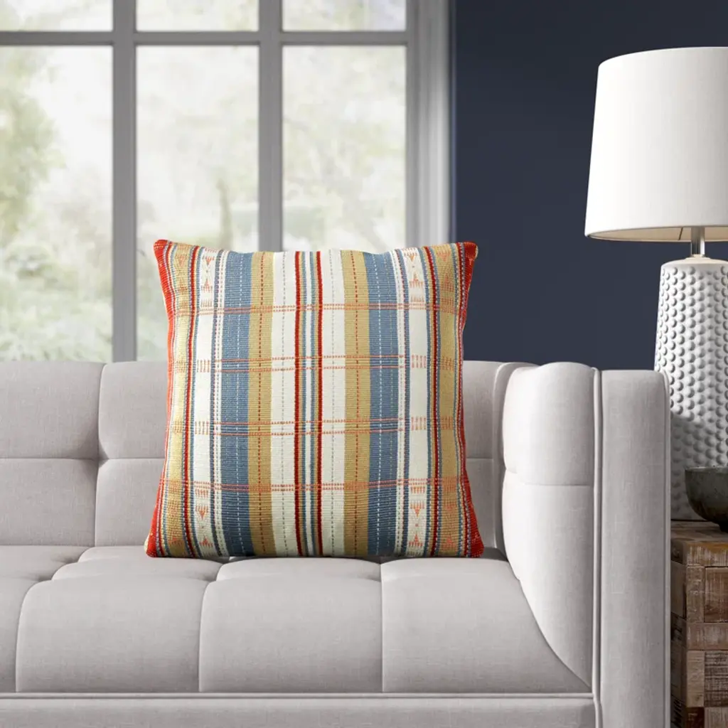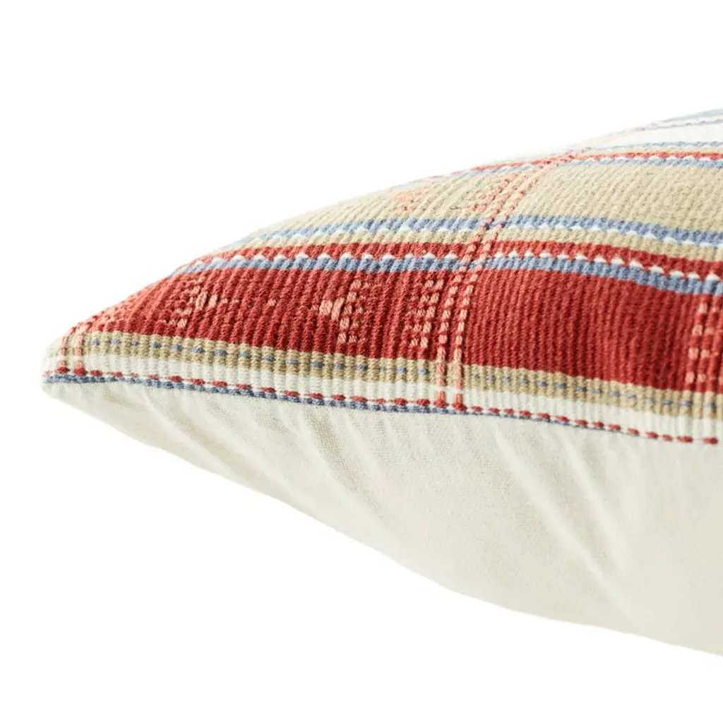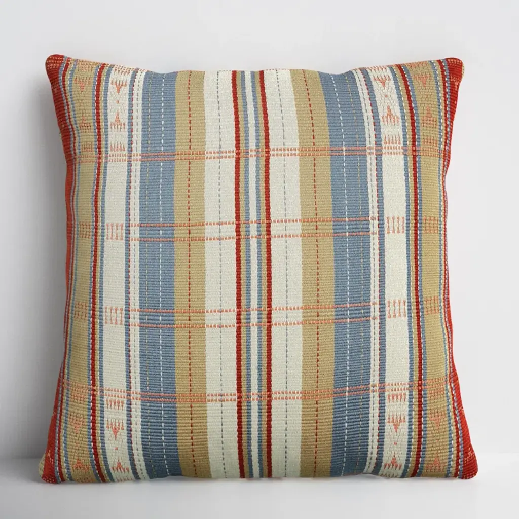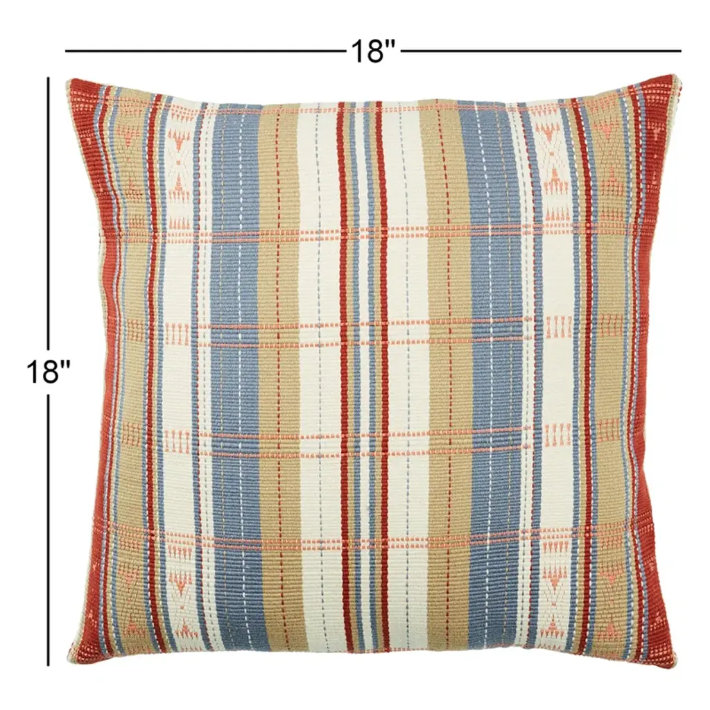 This throw pillow features the traditional loin-loom techniques of indigenous tribes in Nagaland, India. Handcrafted by these weavers, the globally inspired tribal and stripe pattern combined with a tan, red, cream, blue, and gold colorway creates a stunning statement piece. The soft and finely woven cotton material and bohemian style perfect any indoor space in a modern home.
