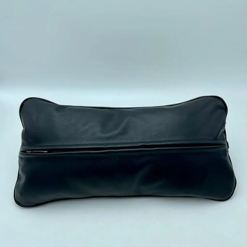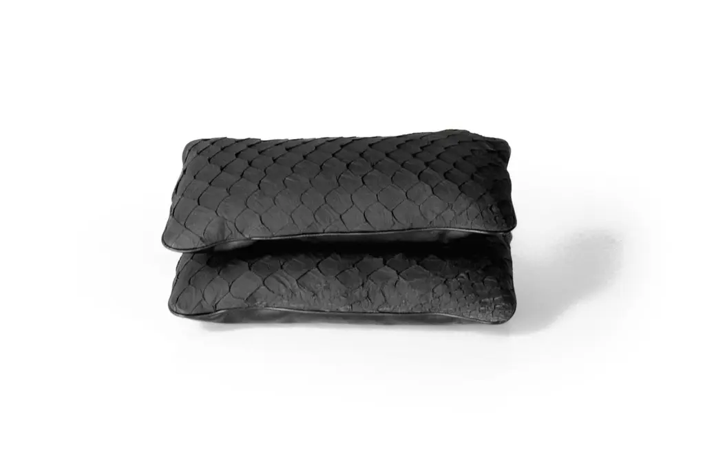 Set of 2 leather cushion, exclusive fish leather black color and black back, small size 15.7 x 7.9 in. Trimmed scales.Fish leather luxury cushion. Skins used on these cushions comes from Brazilian food industry, it is the second largest river fish in the world after the beluga. Vegetable tanning and dyed with anilines. Down feather and Egyptian 500 yarns cotton insert. A unique leather cushion ideal for its texture and diamond patterns that creates a hypnotizing effect, this cushion brings elegance and originality to any modern contemporary interior design. Slightly diverse markings that may occur, show the seal of the craftsman manufacturing.Available in different colors.