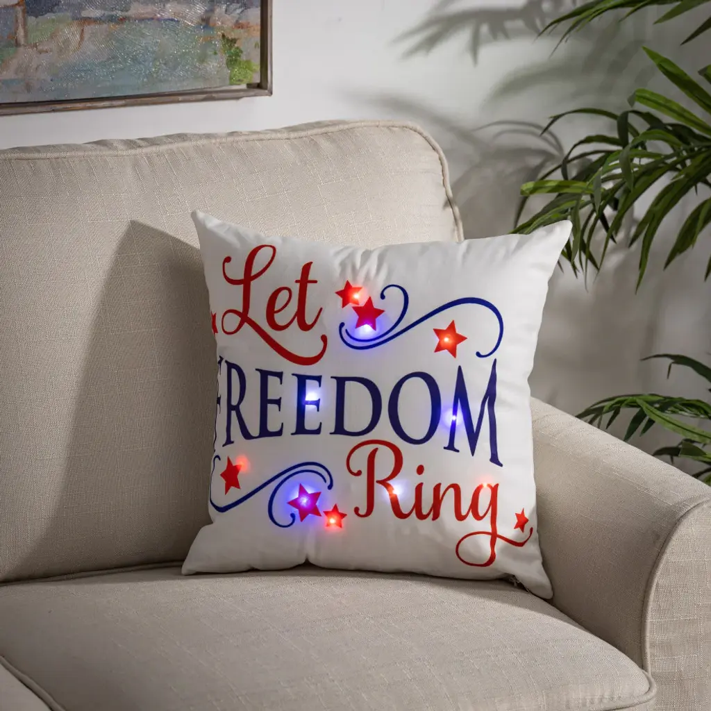 Adorn your house, patio or porch with this set of three 16" square Americana battery operated lighted pillows. The lighted pillows show three patriotic sentiments with lighted stars. Place on your porch, patio or in your home. Each requires 2 AA batteries, not included.
