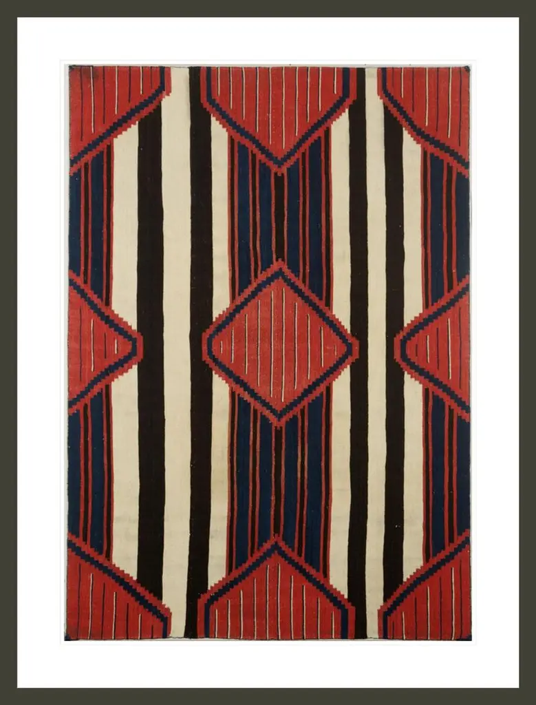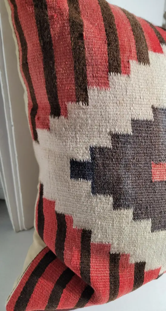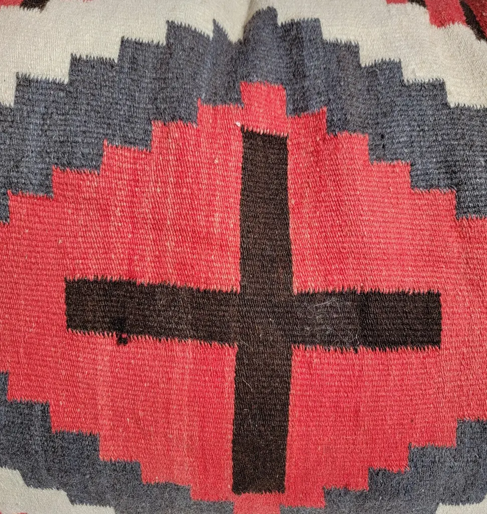 Large Navajo Bolster Pillows. Each pillow is made large due to the wonderful large Cross pattern that was placed on the wool fabric Within the Eye Dazzler. great Striped to accentuate the Center Eye.Hand Dyed with fruits and vegetable dyes. Great red color with dark browns and beige.