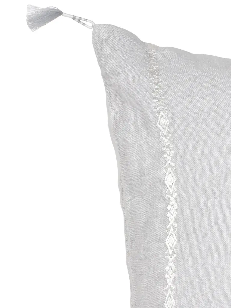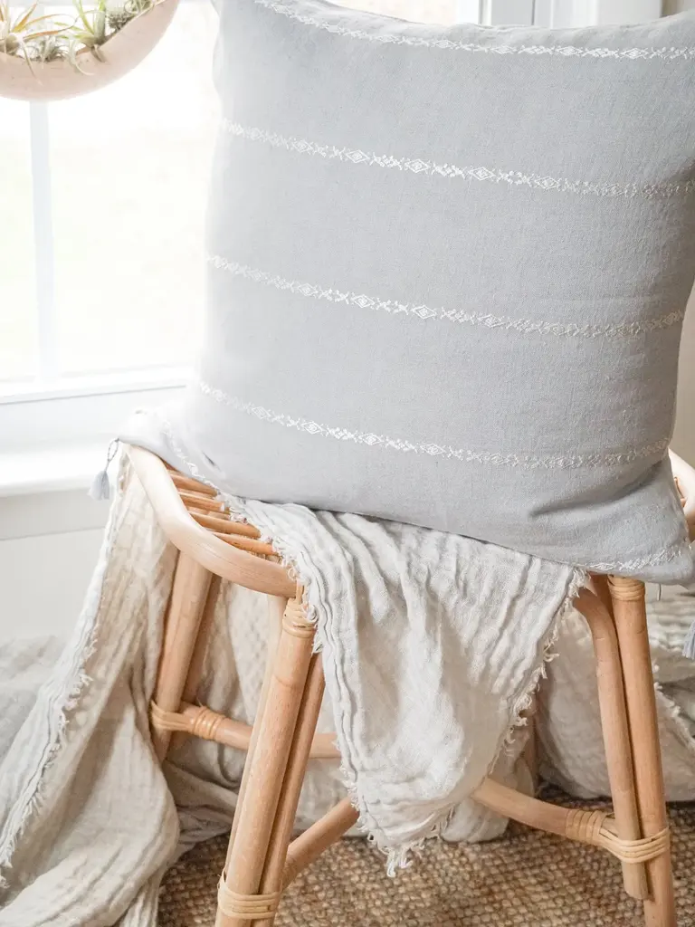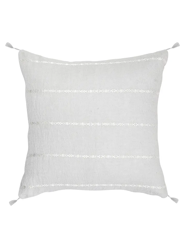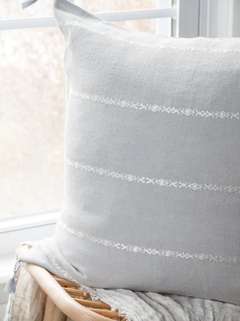The Seville Embroidered Stripe So Soft Linen Pillow is Soo soft- you won’t believe it's linen! DetailsFront & Back Color: Light GreyEmbroidery: WhiteTrim Details on each corner.Front & Back side: 100% Linen (Pre-washed)Concealed zipper closure on back side.Spot Clean. Made in India. Pillows are available in 3 options:Pillow Cover Only, with a Down Alternative insert, or with a Down InsertDown Alternative InsertBenefits: Allergen free, Better back support, Retain their shapeInside Fill: 1.2 denier x1.25" polyester gelOuter Shell: 65% polyester/ 35% white cotton blendMade in the USA Down InsertBenefits: Durable, Easy to fluff and re-style, Retains heatInside Fill: 95% gray duck feathers and 5% goose downOuter Shell: 233-thread count 100% cotton fabric Made in the USA