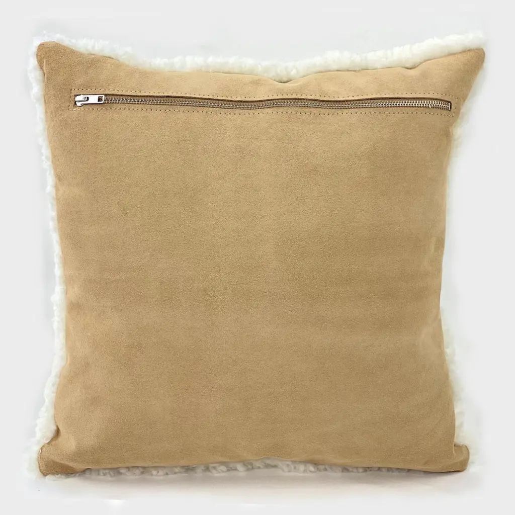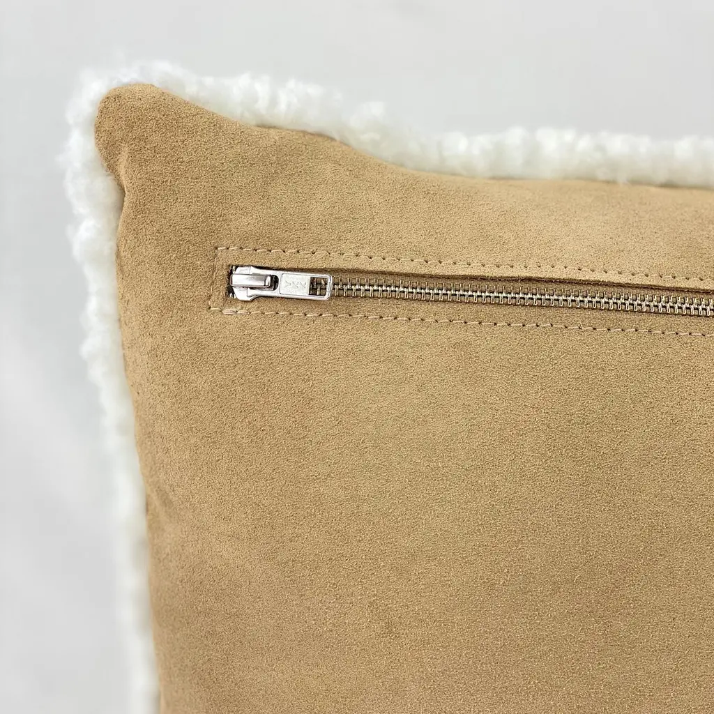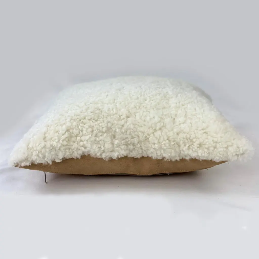 Add a refreshing touch to your interior with this white shearling sheepskin pillow. The sheepskin wool features a curly short wool pile that will add inviting and charming textures to a room. Part of the boucle collection, this shearling pillow translates contemporary Nordic design while expressing natural and sustainable designer living.Designed and individually hand-crafted in Australia using ethically sourced natural by- product and high quality Australian shearling sheepskin. The single sided shearling pillow front is complimented with a genuine suede leather reverse available in two color options: suede tan or suede dove grey. The 18x18" square pillow is fitted with a cozy 100% feather insert, to complete the 100% natural and sustainable design.Designer, Emily Barbara is all about living with 100% natural products derived from sustainable animal skins, leathers and sheepskin. The shearling cushion is available in a range of shapes, sizes and colors. As makers and artisans in sheepskin home decor this shearling sheepskin can be custom made into rugs, pillows and bench seats to suit your decor and project needs. Please contact us for further details. Features:Australian shearling sheepskinColour: White VanillaFront sided sheepskinGenuine suede leather reverse / two colour optionTwo color option reverseSize: 45 x 45cm / 18x18"Wool pile: 12-14mm (up to 1/2" pile)Made in Australia Feather cushion insert includedNatural product:It needs to be celebrated that this shearling pillow is made from 100% natural product. Variation between each pillow will occur in the wool pile texture and colour tones. The reverse is genuine suede leather, natural markings and leather imperfections are classed as natural characteristics.Product care for your Shearling Pillow:Keep away from direct sunlightProfessional dry clean onlyDo not wash or submerge into waterShake out often to remove dust or give light vacuumSpot clean only with gentle wool detergent.Do not brush.Professional dry clean only.