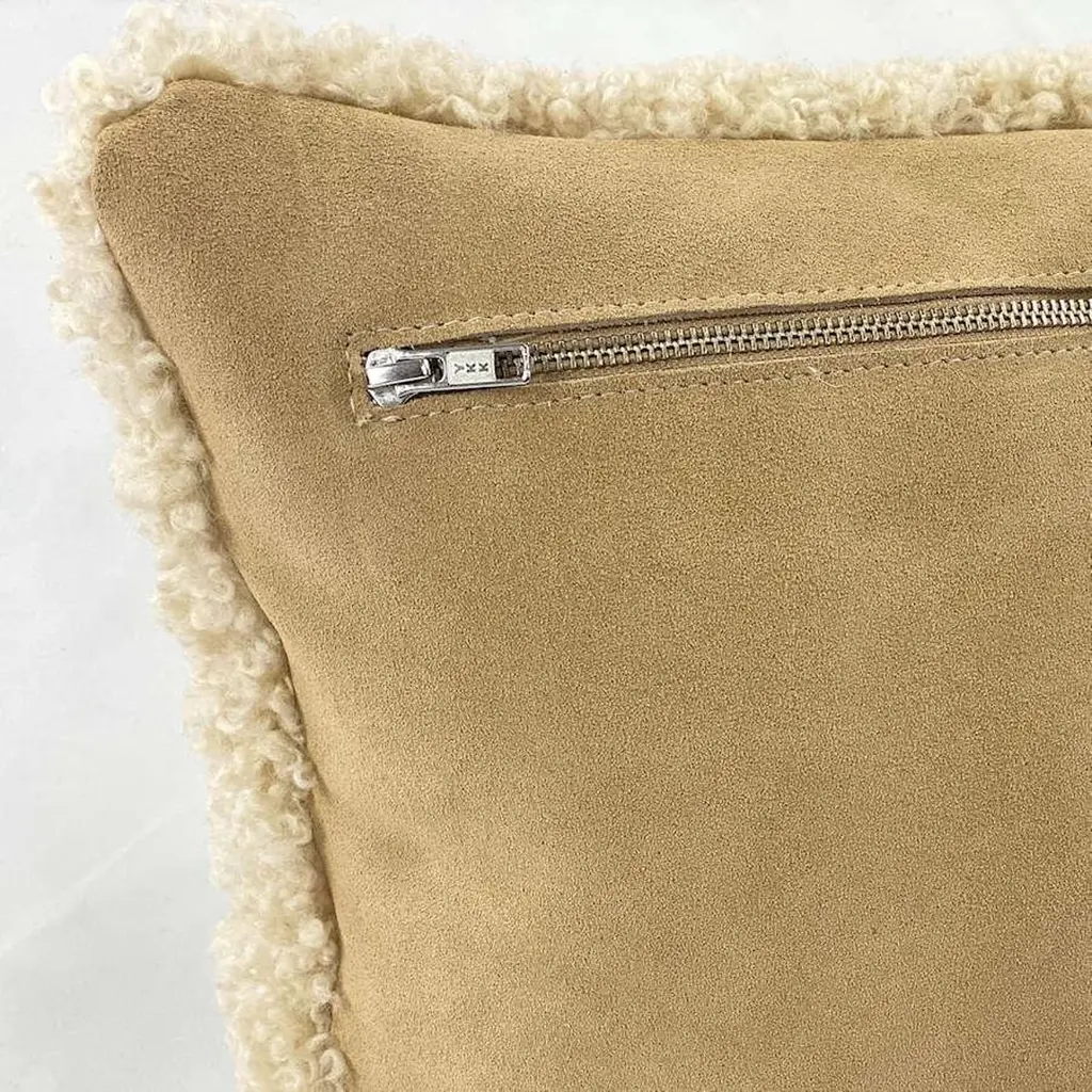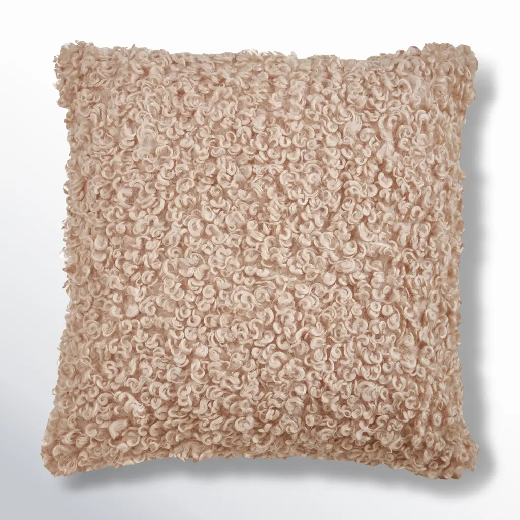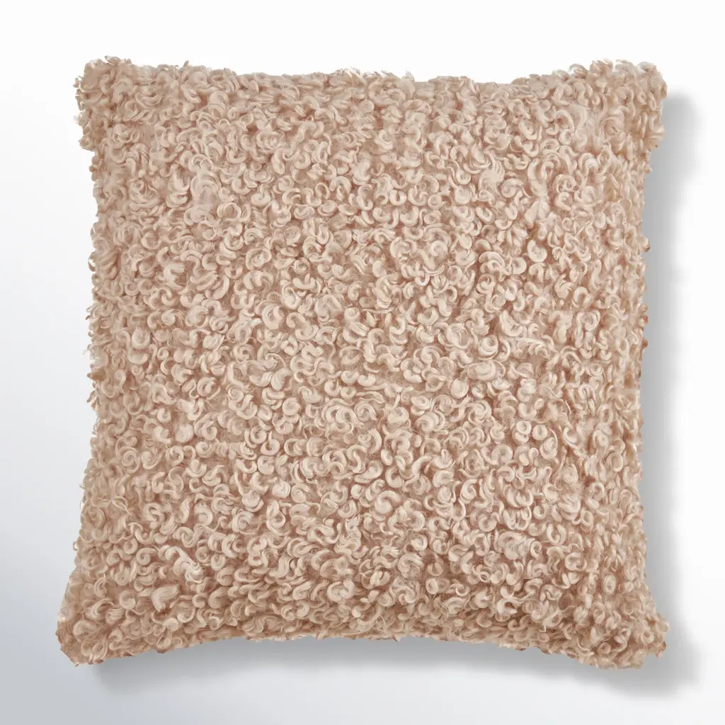Add charming tactile textures to your interior decor with this large shearling sheepskin pillow. The boucle style wool pile features a short curly wool that will bring sustainable styling to life. Translating contemporary design paralleled with comfort, expressing natural signature living.Featuring a beautiful 100% wool texture in sandy color tones that will uplift any piece of furniture with charm and charisma with minimal fuss.This Boucle Collection of Australian made pillow are handcrafted by Artisans using high quality Australian shearling sheepskin, measuring approximately 20" x 20" with wool pile. The shearling sheepskin pillow front is complimented with a tan suede leather reverse and decorative metal zipper, and fitted with a feather insert.Eluxury Home are innovators in animal skin and sheepskin home decor, offering customized make for any shape and size pillows and seated cushions. Features:Australian shearling sheepskinColour: Dark LinenFront sided sheepskinReverse suede leatherSize: 50 x 50cmWool pile: 12-14mm (up to 1/2" pile)Made in Australia Feather cushion insert includedNatural Product:It needs to be celebrated that this shearling pillow is made from 100% natural product. Variation between each pillow will occur in the wool pile texture and colour tones. The reverse is genuine suede leather, natural markings and leather imperfections are classed as natural characteristics.Product care for your Shearling Pillow:Keep away from direct sunlightProfessional dry clean onlyDo not wash or submerge into waterShake out often to remove dust or give light vacuumSpot clean only with gentle wool detergent.Do not brush.Professional dry clean only.