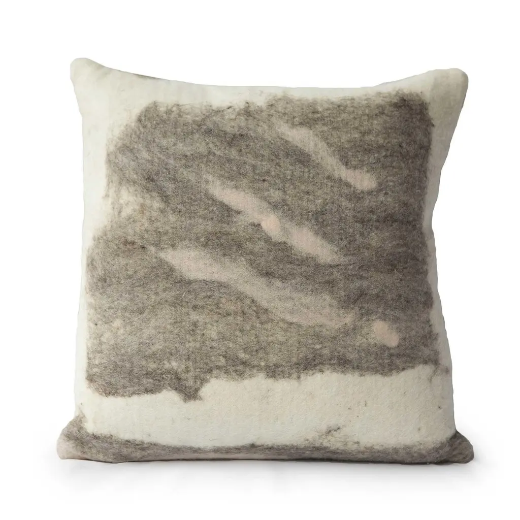 Made of Shetland sheep wool and milled in-house at JG Switzer's design workshop The Shetland Rose is grey Shetland wool with pink wisps on creamy Merino wool. Ships with removable insert and designed to keep its shape. One of a kind. Reversible with different back design means you can have twice the pillow. Dimensions are 20x20". Shetland sheep are listed on the Livestock Conservancy's list as "at risk" breeds. Your purchase supports small flocks and their farmers.