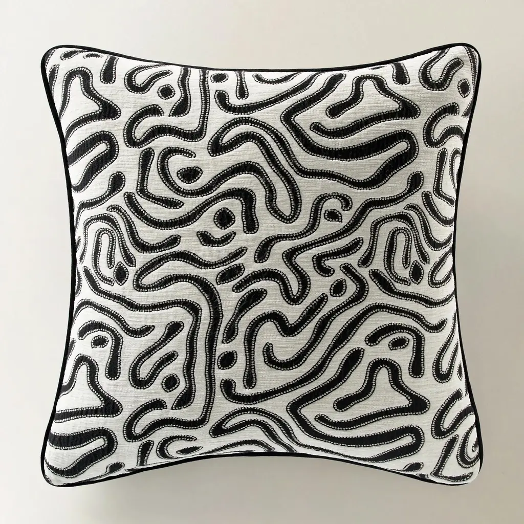 This pillow features Riley Embroidery with a self welt finish. A modern take on a classic vermicelli pattern, Riley features a loose meandering motif embroidered in fine thread on a cotton-linen ground. Pillow includes a feather/down fill insert and hidden zipper closure.