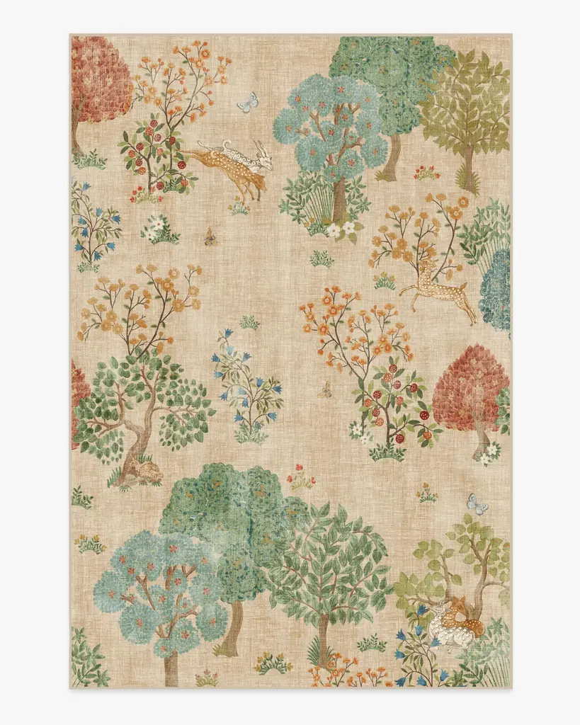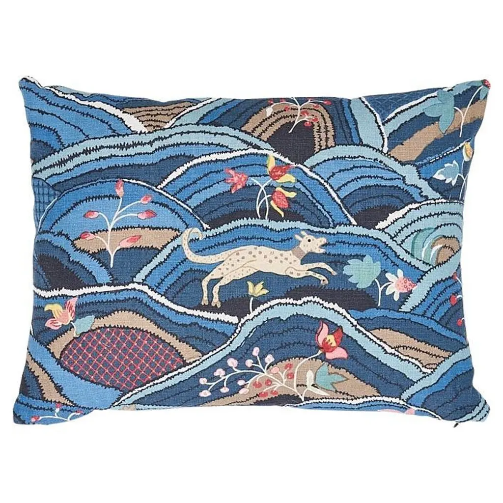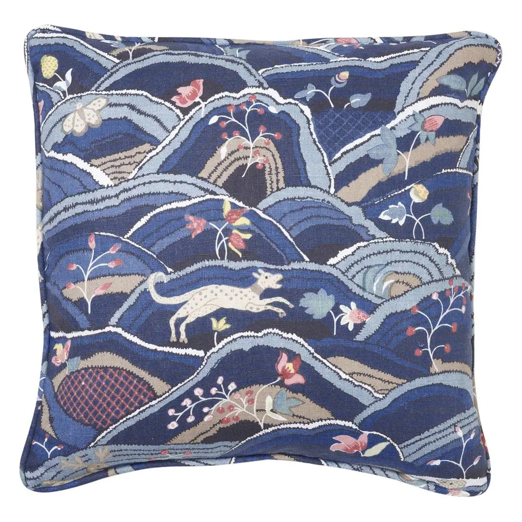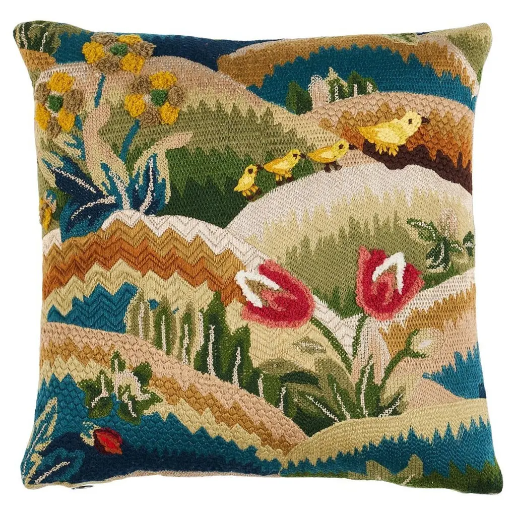 This pillow features Rolling Hills with a knife edge finish. Charming animals gambol within a naïve landscape in this whimsical full-coverage print. This design preserves the rustic simplicity of the embroidered original, which dates to 1960. Back of pillow is Piet Performance Linen. Pillow includes a feather/down fill insert and hidden zipper closure.