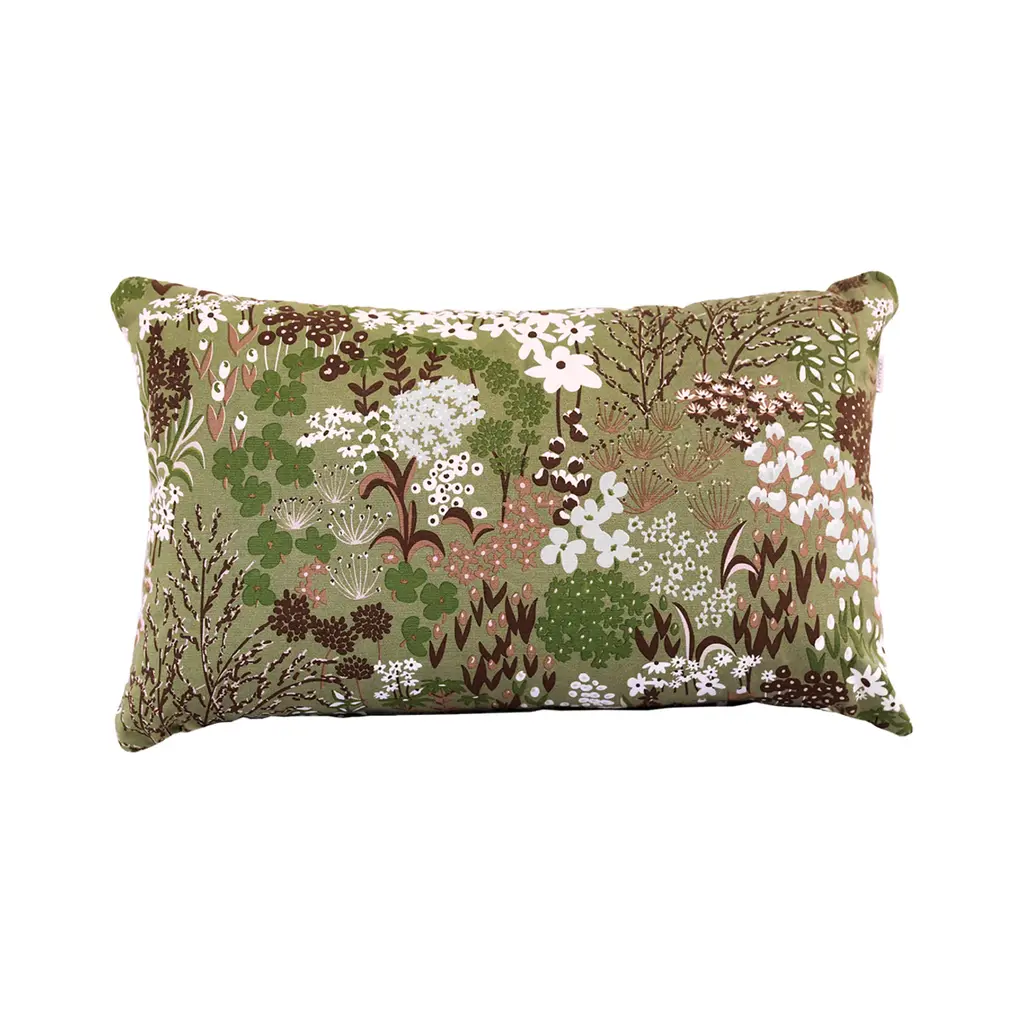 This pillow features Rolling Hills with a knife edge finish. Charming animals gambol within a naïve landscape in this whimsical full-coverage print. This design preserves the rustic simplicity of the embroidered original, which dates to 1960. Back of pillow is Piet Performance Linen. Pillow includes a feather/down fill insert and hidden zipper closure.