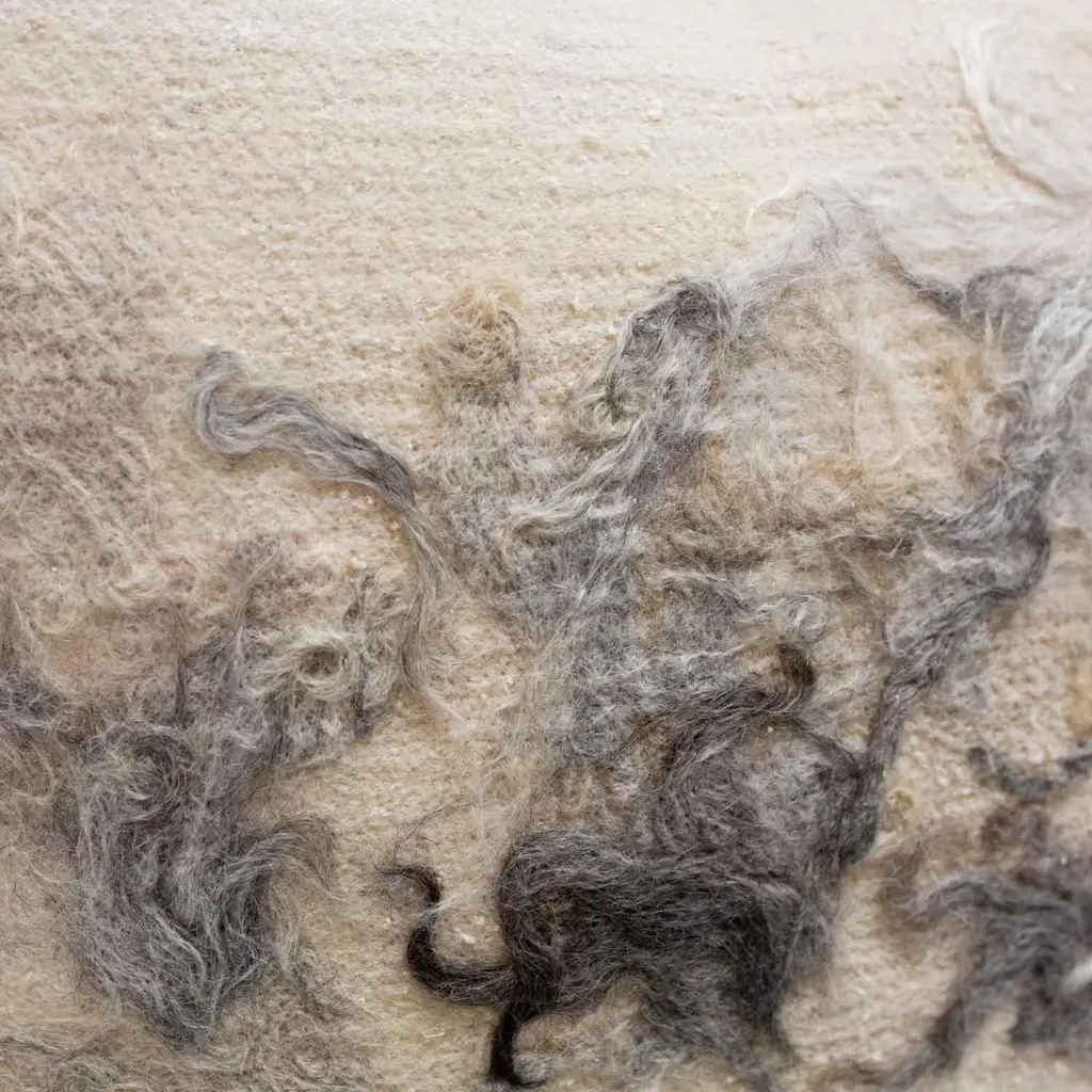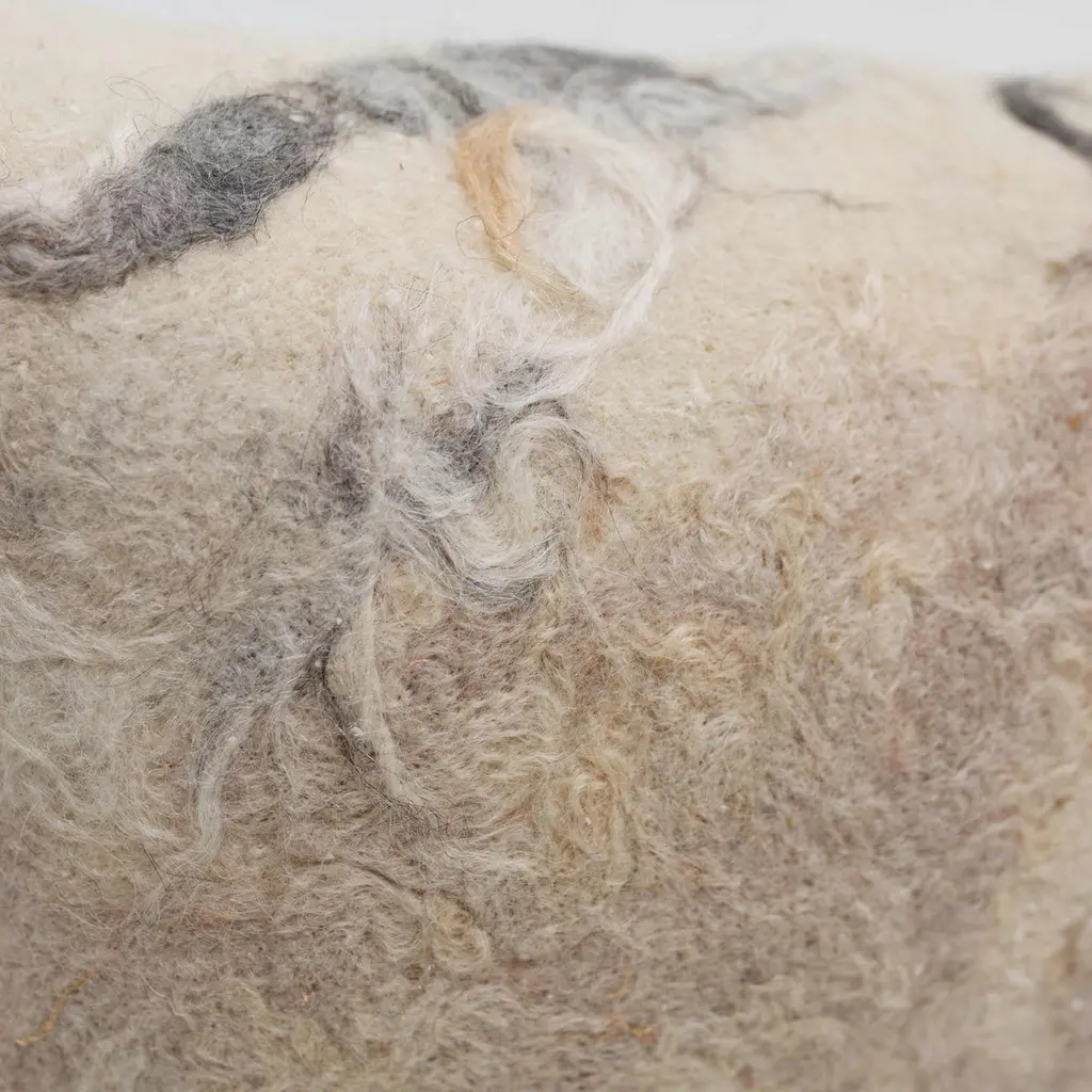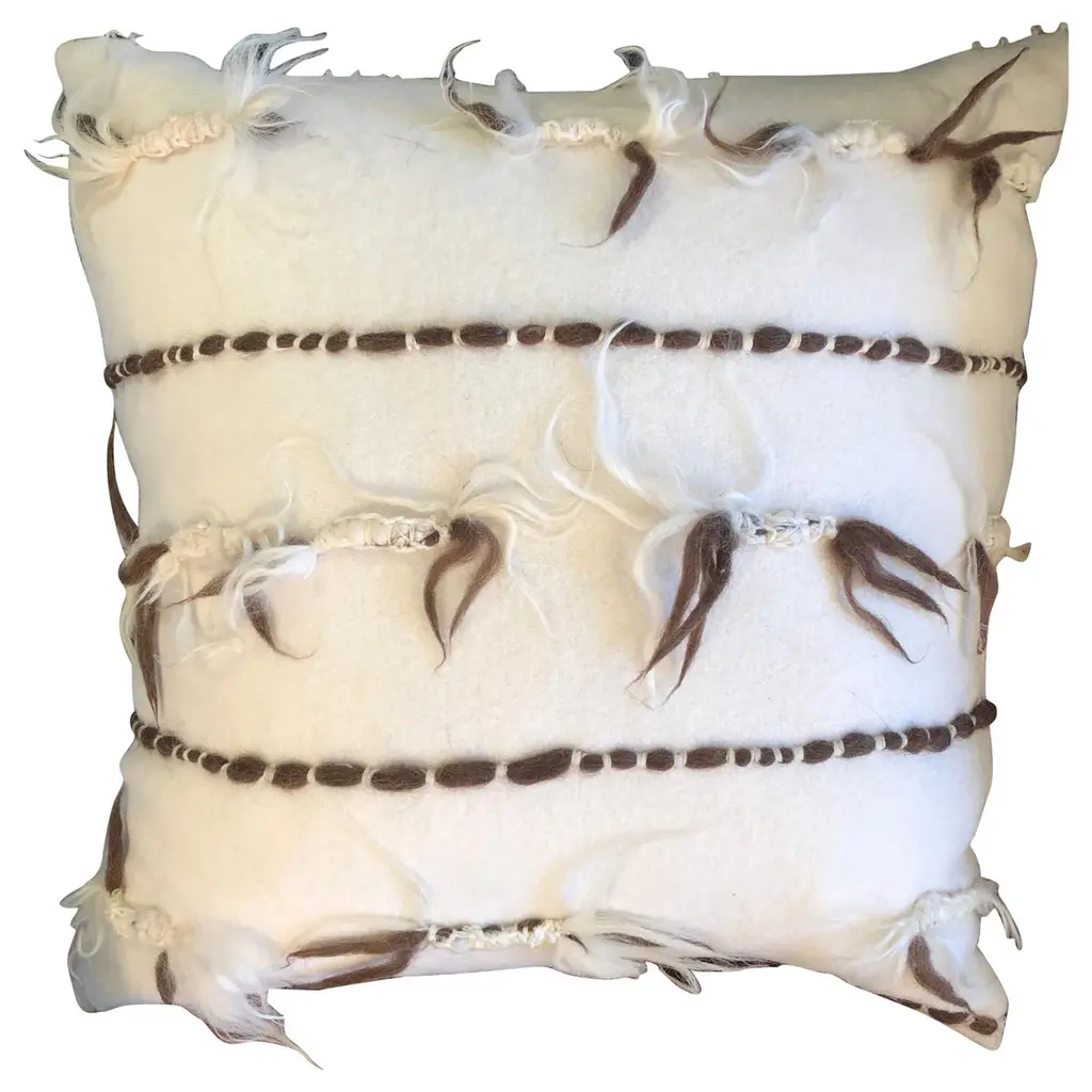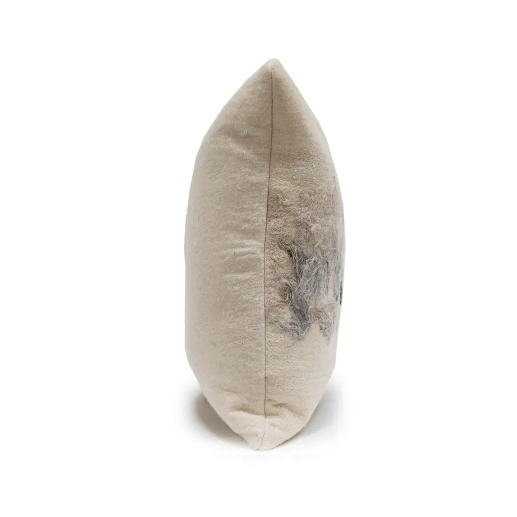 Felted from local and heritage breed sheep "painted" with accents of raw wool and cashmere. This pillow fabric is cream and taupes, with a linen back. Fabric and pillows are made to order in our USA workshop where we felt our own wool fabric. Pre-washed. Custom sewn means no two pillows are exactly alike, and design will vary with each piece. We sew as we go and are devoted to quality. Dimensions: 20" square. Insert is our custom, high quality fill insert designed to never lose its shape. Invisible zipper case, dry clean only. Ships with muted copper linen backing unless wool silk is specified.