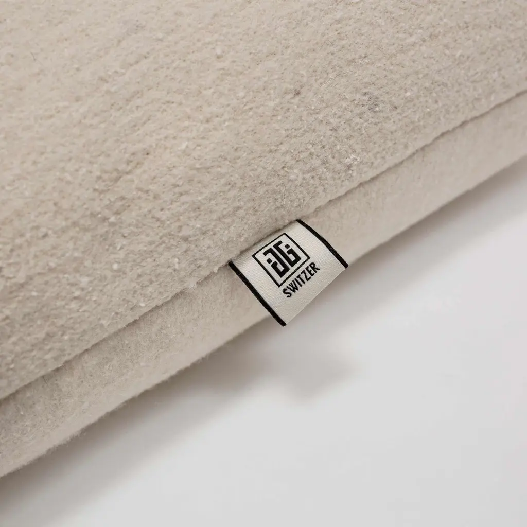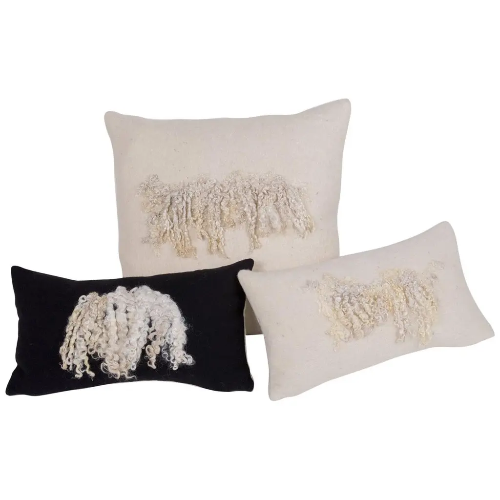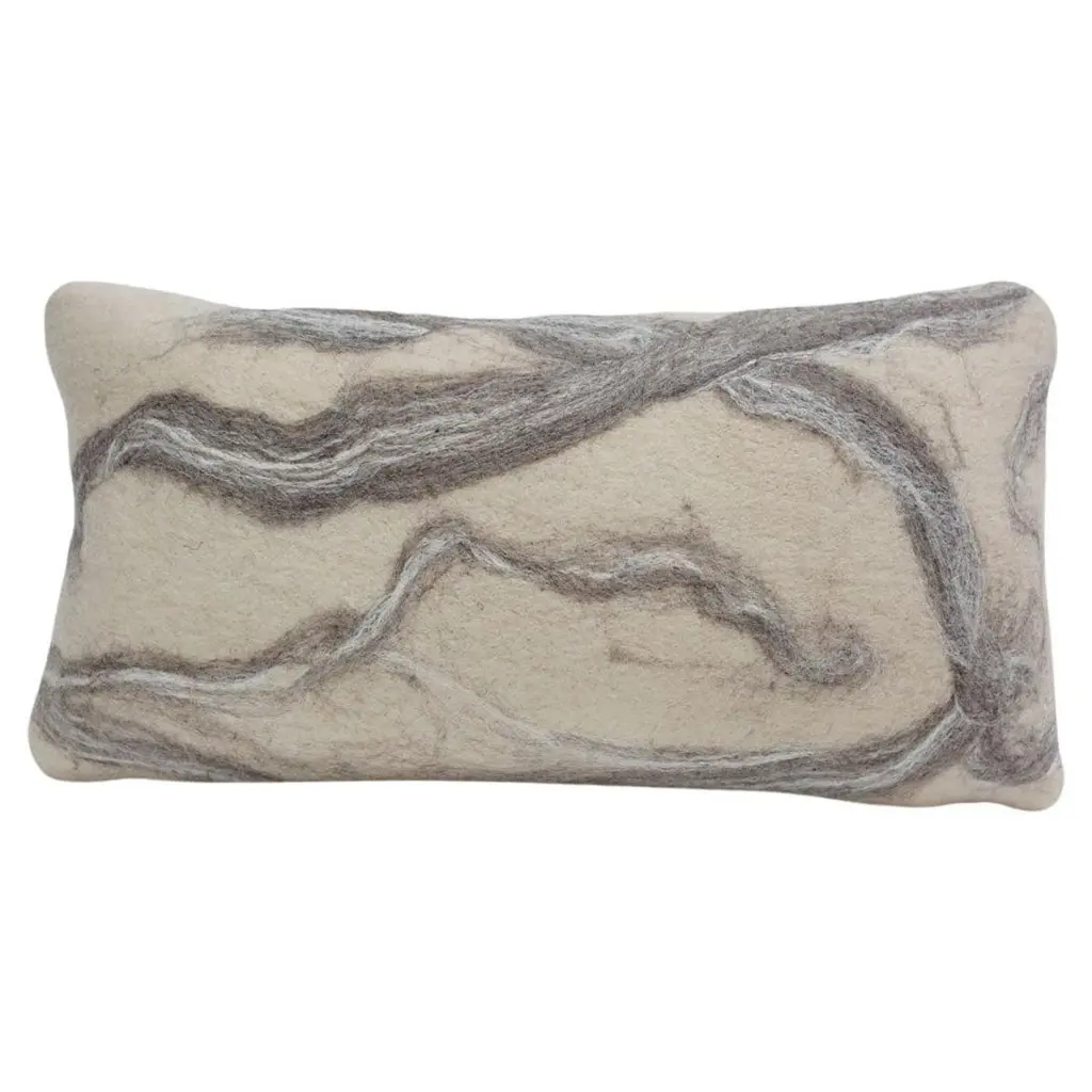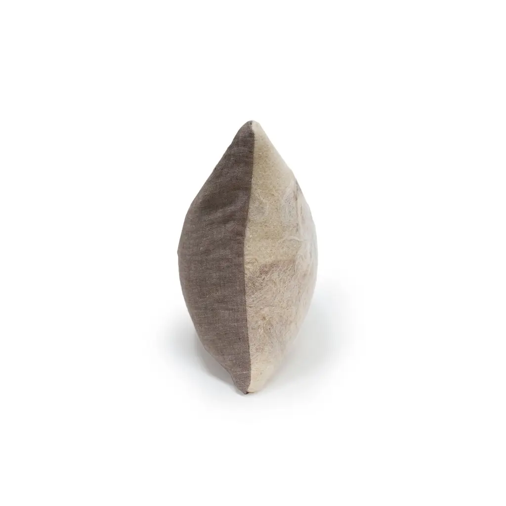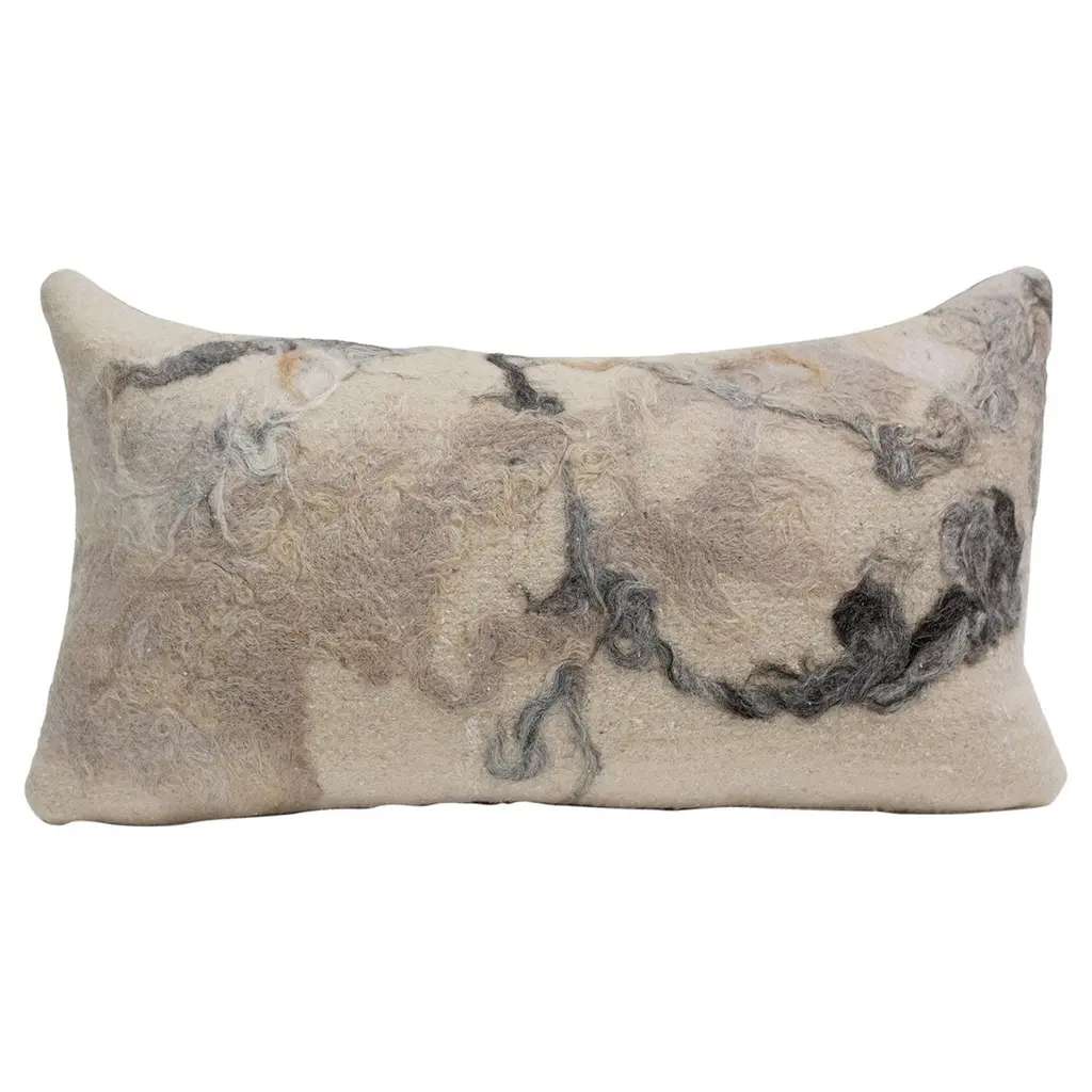 Felted from local and heritage breed sheep "painted" with accents of raw wool and cashmere. This pillow fabric is cream and taupes, with a linen back. Fabric and pillows are made to order in our USA workshop where we felt our own wool fabric. Pre-washed. Custom sewn means no two pillows are exactly alike, and design will vary with each piece. We sew as we go and are devoted to quality. Dimensions: 20" square. Insert is our custom, high quality fill insert designed to never lose its shape. Invisible zipper case, dry clean only. Ships with muted copper linen backing unless wool silk is specified.