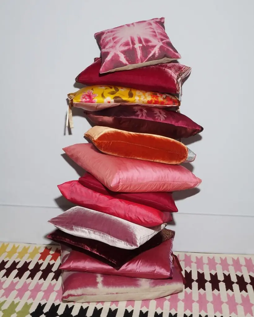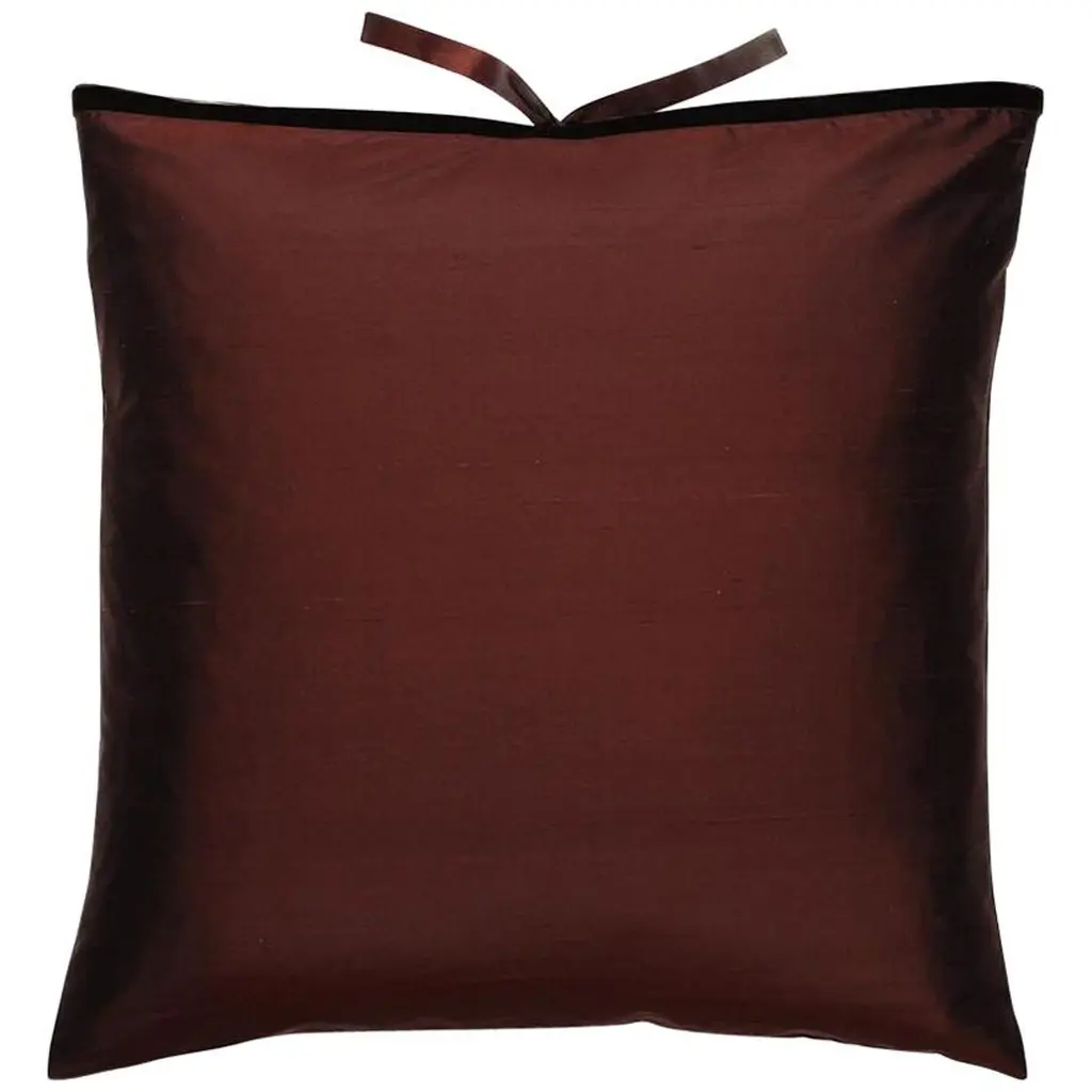 A luxury handmade decorative throw pillow made of natural silk dupioni great for using color to brighten up a contemporary living room, bedroom or lounge. Silk dupioni is a high quality, tightly woven, crisp silk with an iridescent effect. The iridescence due to mixed color weaving allows it to blend with many similar colors and hues. The edge is minimally tailored with a solid complimentary color velvet trim. The cushion cover has a functional and decorative silk tie closure, and silk insert flap. The traditional knot tie closure on the top ensures that there are no hard elements on our pillows like buttons or zippers. The pillow includes a generously filled feather and down blend insert. This toss cushion is designed by Michele Varian and handcrafted in NYC.Product details:Solid silk dupioni cover with velvet trimSilk tie closureRemovable American-made insert included 95% feather 5% downPlease inquire regarding a hypoallergenic insert optionMeasures: 22 inches x 22 inchesDry clean removable cover onlyMade in NYC.