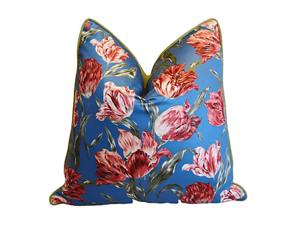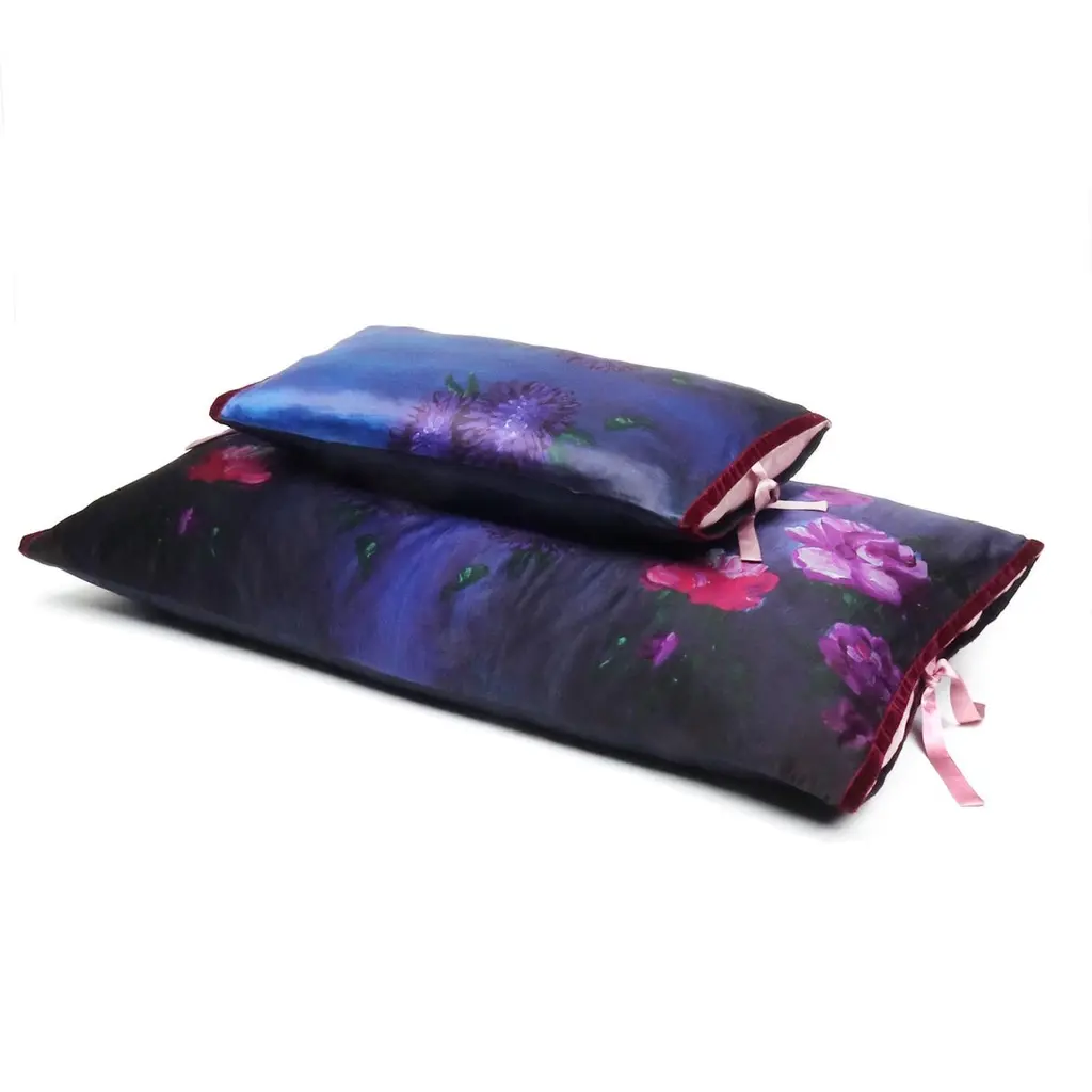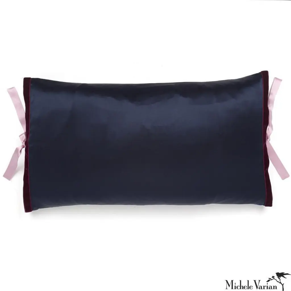 A luxury handmade decorative throw pillow made of solid silk charmeuse,great for using color and pattern to brighten up a contemporary livingroom, bedroom or lounge. Silk charmeuse is a high quality, lightweightfabric woven with a satin weave. It has a lustrous and smooth reflectivesurface. The front has a modern print and the reverse side is solidsilk. The edge is minimally tailored with a solid complimentarycolor velvet trim. It has a functional and decorative silk tie closure,and silk insert flap. The traditional knot tie closures at the sidesensure that there are no hard elements on our pillows like buttons orzippers. The pillow includes a generously filled feather and down blendinsert. This toss cushion is designed by Michele Varian and handcrafted in NYC.Product detailsSilk CharmeuseSilk tie closureRemovable American-made insert included 95% feather 5%downPlease inquire regarding a hypoallergenic insert optionMeasures: 12 inches x 22 inchesDry clean removable cover onlyMade in NYC.