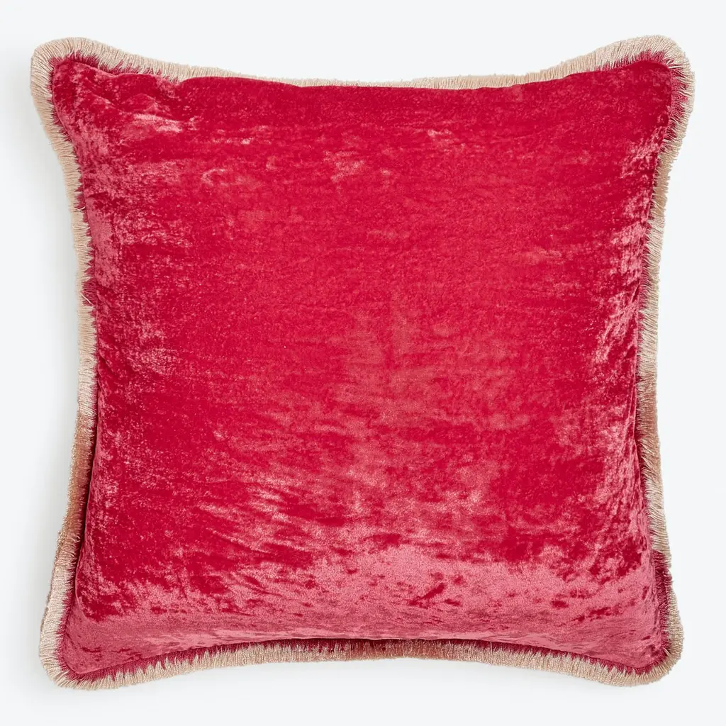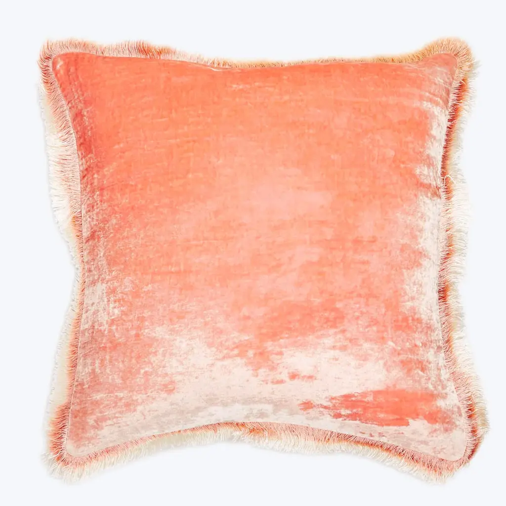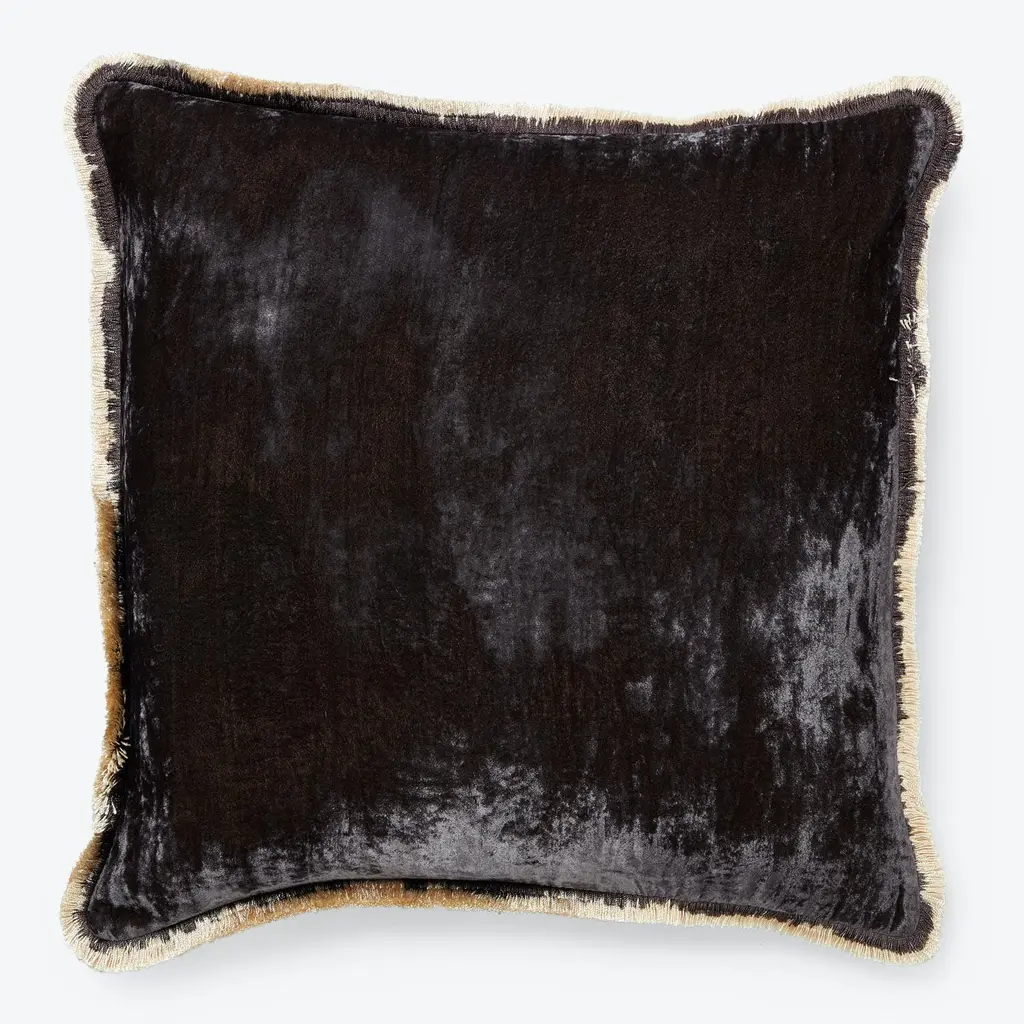 Transform your home with the timeless sophistication of our Silk Velvet Fringe Pillow, meticulously handcrafted in India. Made from 100% pure silk velvet, this pillow boasts a sumptuous texture and a radiant finish that brings a luxurious touch to any space. The 20” L x 20” W dimensions make it the ideal size for layering on a sofa, accent chair, or bed, while its elegant fringe edging adds an artisanal flair. The fabric is hand-dyed, creating subtle color variations and a softly distressed elegance unique to every piece. This velvet fringe pillow is available in an array of opulent tones, making it a versatile statement piece. Perfect for those seeking lasting aesthetics, these velvet pillows with fringe create a harmonious blend of style and comfort. Let the soft shimmer and intricate details of this silk velvet pillow elevate your décor to new heights of elegance.