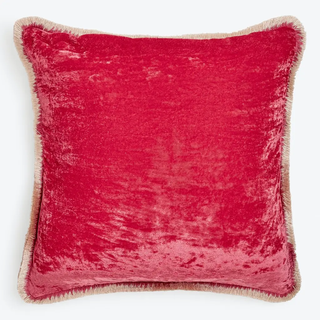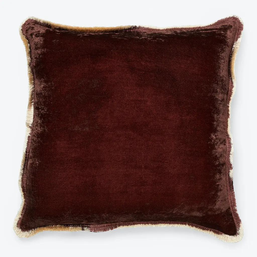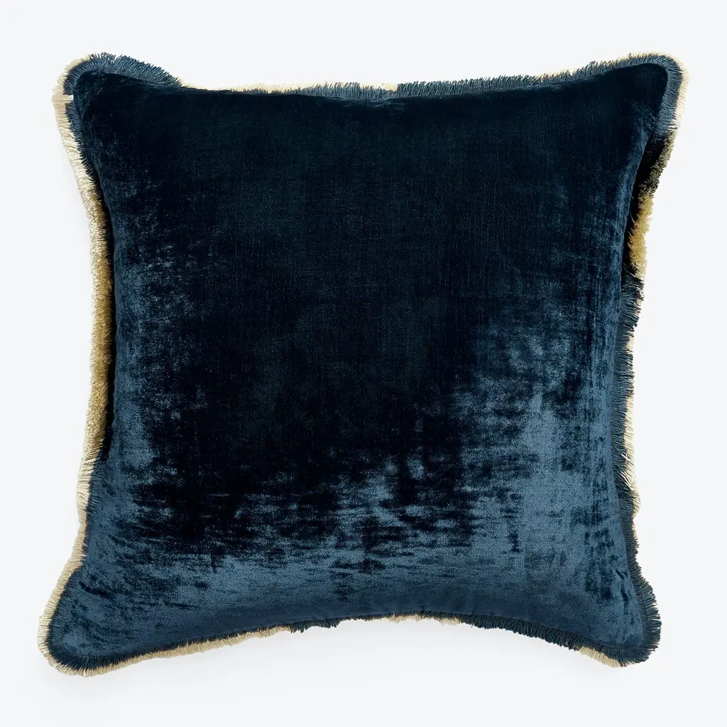 Transform your home with the timeless sophistication of our Silk Velvet Fringe Pillow, meticulously handcrafted in India. Made from 100% pure silk velvet, this pillow boasts a sumptuous texture and a radiant finish that brings a luxurious touch to any space. The 20” L x 20” W dimensions make it the ideal size for layering on a sofa, accent chair, or bed, while its elegant fringe edging adds an artisanal flair. The fabric is hand-dyed, creating subtle color variations and a softly distressed elegance unique to every piece. This velvet fringe pillow is available in an array of opulent tones, making it a versatile statement piece. Perfect for those seeking lasting aesthetics, these velvet pillows with fringe create a harmonious blend of style and comfort. Let the soft shimmer and intricate details of this silk velvet pillow elevate your décor to new heights of elegance.