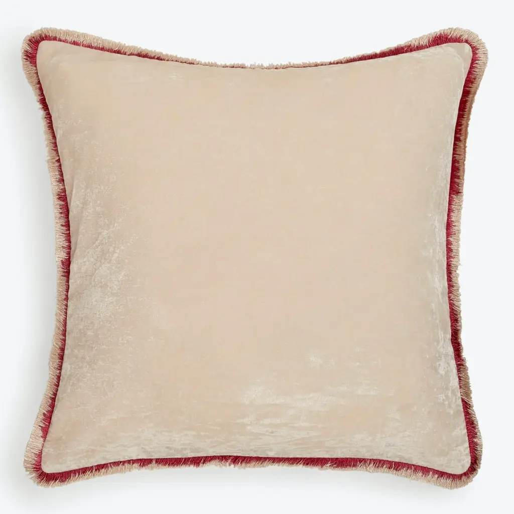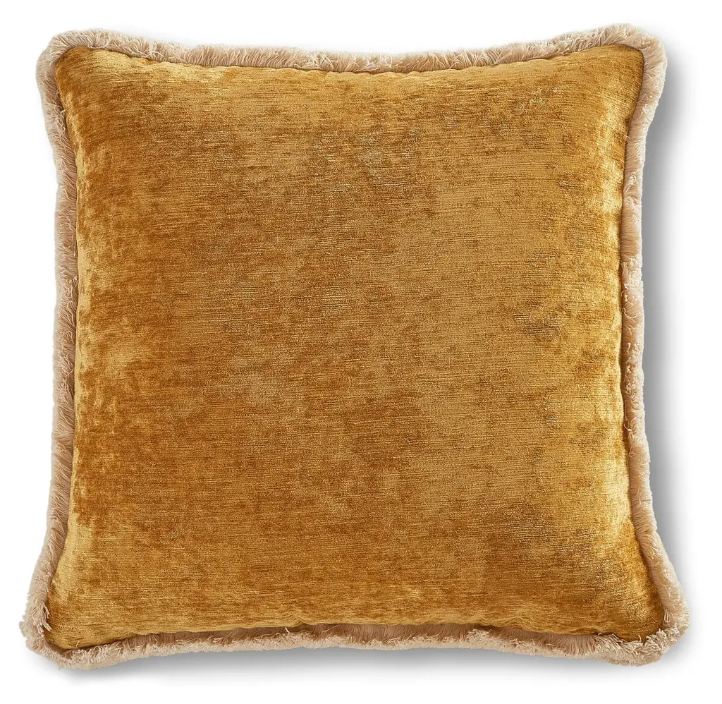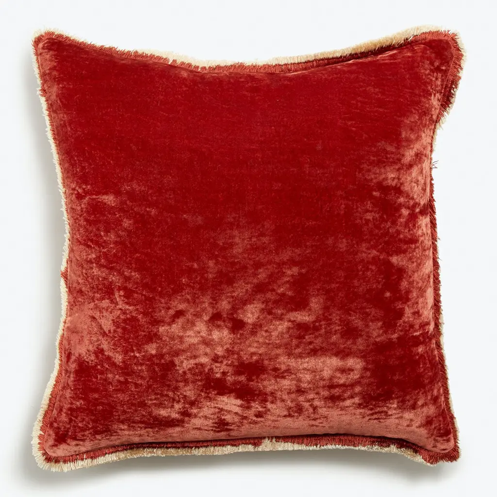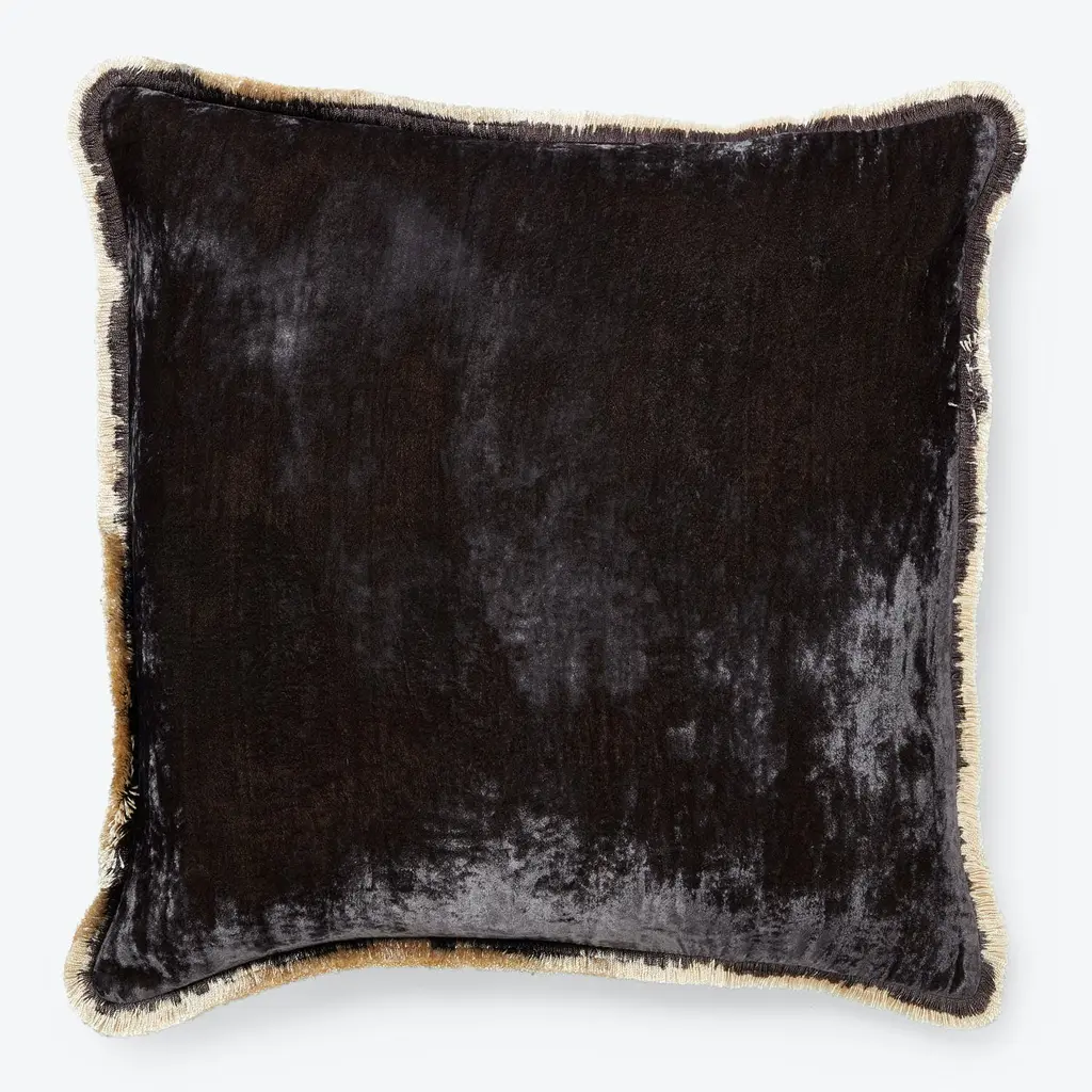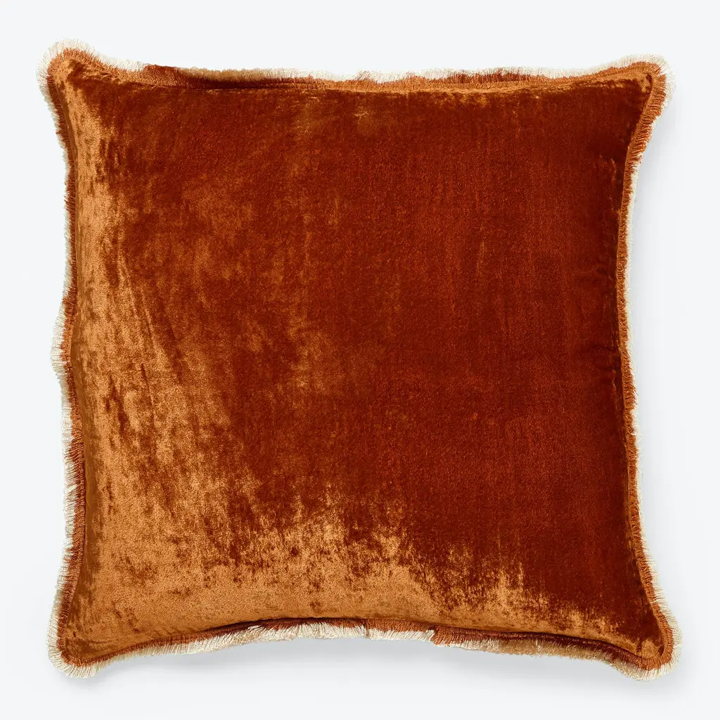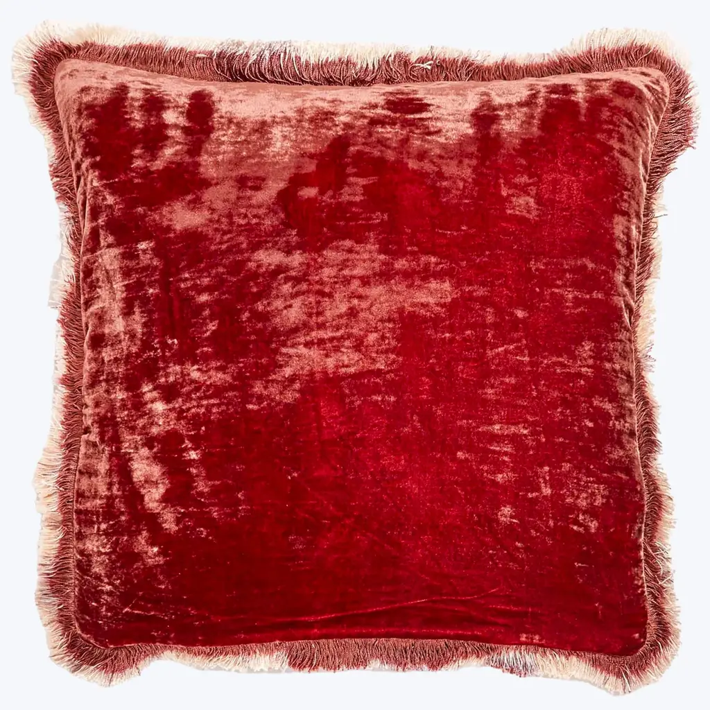 Transform your home with the timeless sophistication of our Silk Velvet Fringe Pillow, meticulously handcrafted in India. Made from 100% pure silk velvet, this pillow boasts a sumptuous texture and a radiant finish that brings a luxurious touch to any space. The 20” L x 20” W dimensions make it the ideal size for layering on a sofa, accent chair, or bed, while its elegant fringe edging adds an artisanal flair. The fabric is hand-dyed, creating subtle color variations and a softly distressed elegance unique to every piece. This velvet fringe pillow is available in an array of opulent tones, making it a versatile statement piece. Perfect for those seeking lasting aesthetics, these velvet pillows with fringe create a harmonious blend of style and comfort. Let the soft shimmer and intricate details of this silk velvet pillow elevate your décor to new heights of elegance.