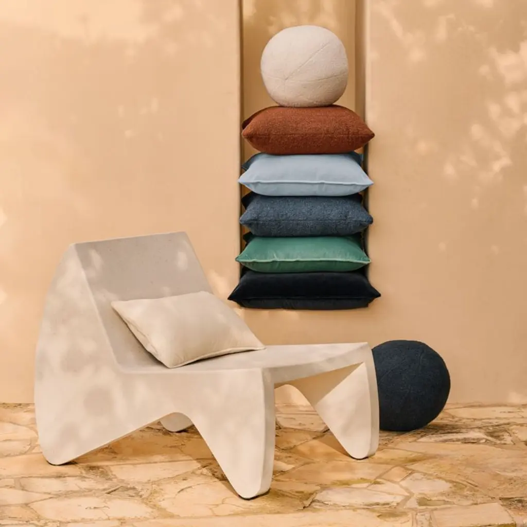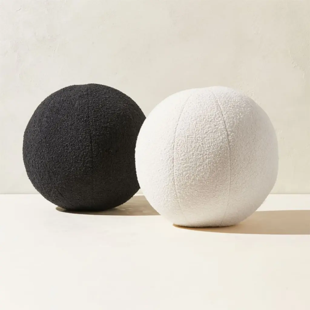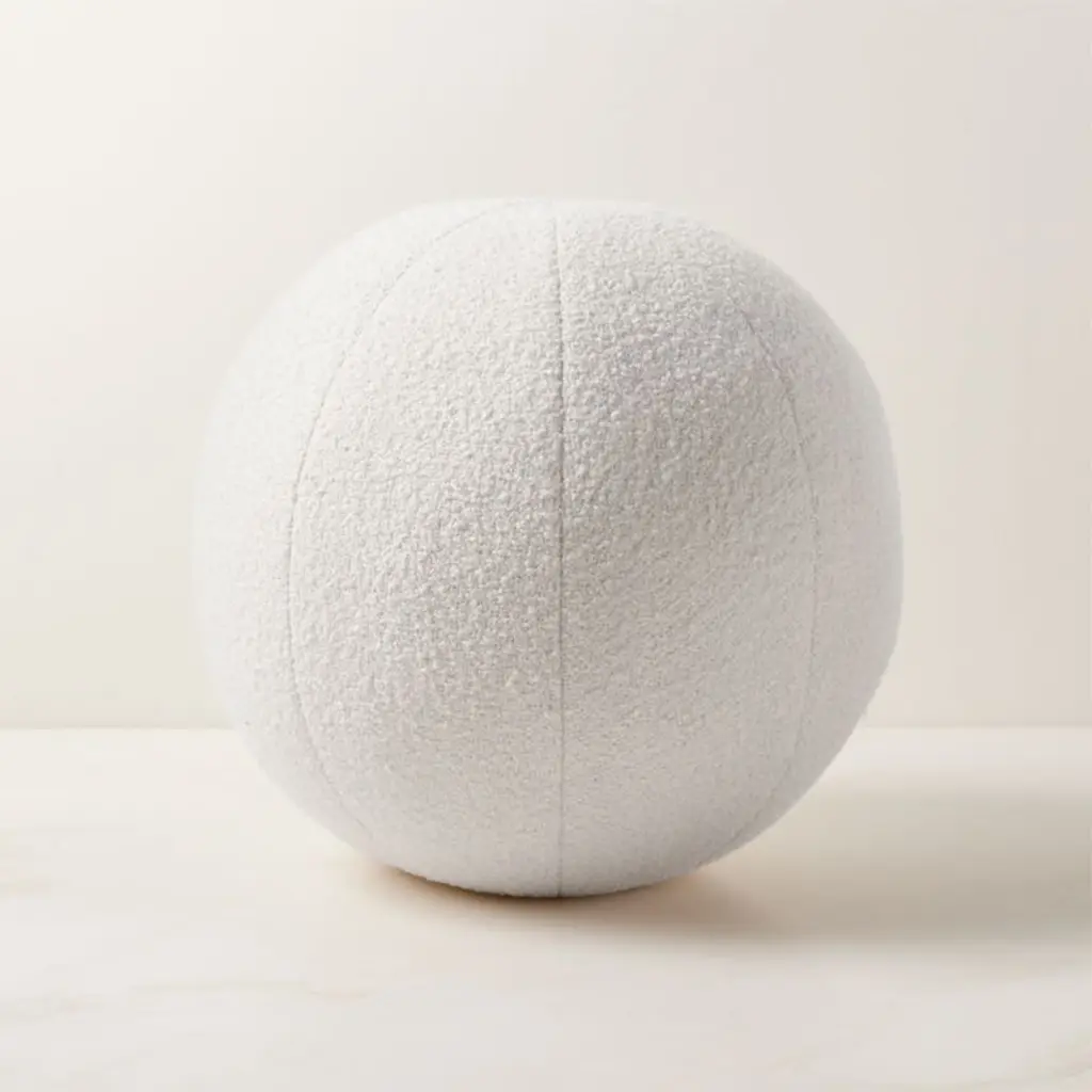 Handwoven of recycled yarns, outdoor pillow is characterized by the nubby texture and soft hand of bouclenow in a fresh sphere shape that instantly updates any space. CB2 exclusive.
