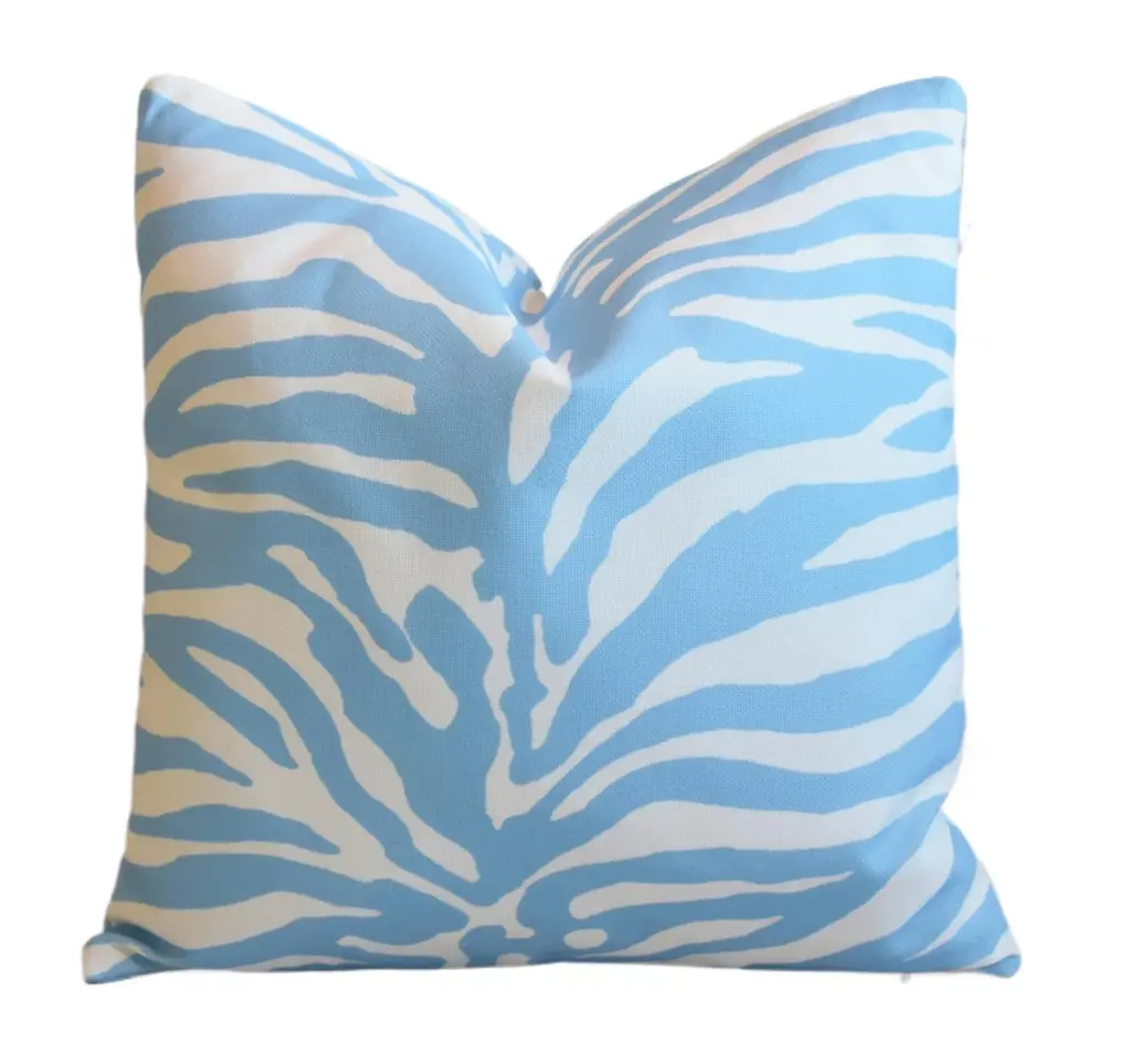 Custom-tailored pillow in a woven cotton-blend fabric depicting a sky-blue and white tiger stripe design. Same fabric on the reverse. The design has been meticulously center on the front and reverse. Hidden zipper closure. New ultra plump goose feather-and-down insert. Excellent new, unused condition!! ***PLEASE NOTE: I will combine shipping whenever possible if you purchase multiple items from my shop. Warm regards, Mike Seratt ***Also don't forget to take a peek at my other current listings...you just might find something you can't live without!!! It's easy just click on my name to the right of any listing highlighted in black "Mike Seratt of The Prized Pig" and presto it will bring you to my storefront!!! Cheers!!! Mike Seratt I SHIP OUT IMMEDIATELY, SO THE ESTIMATION YOU SEE FOR THE DELIVERY TIMELINE IS CHAIRISH'S OVERALL GENERAL TIMELINE, BUT I WILL GET THIS OUT THE NEXT DAY AND DELIVERY IS USUALLY 5-7 DAYS AT MOST