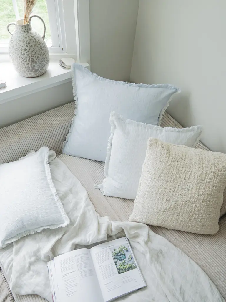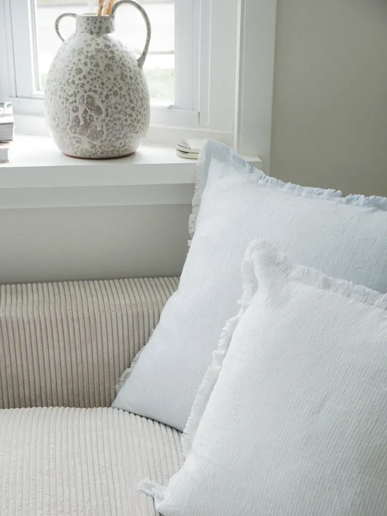 The Sky Blue Fringe Soft Linen Pillow is Soo soft- you won’t believe it's linen! This yarn has a slight nub which gives it a beautiful natural texture. Edges have a self-fringe on all sides. Details Front & Back Color: Sky Blue Front & Back side: 100% Linen (Pre-washed) Concealed zipper closure on back side. Hand washing or a delicate cycle with like colored fabrics recommended. Hang to Dry. Made in India. Pillows are available in 3 options:Pillow Cover Only, with a Down Alternative insert, or with a Down InsertDown Alternative InsertBenefits: Allergen free, Better back support, Retain their shapeInside Fill: 1.2 denier x1.25" polyester gelOuter Shell: 65% polyester/ 35% white cotton blendMade in the USA Down InsertBenefits: Durable, Easy to fluff and re-style, Retains heatInside Fill: 95% gray duck feathers and 5% goose downOuter Shell: 233-thread count 100% cotton fabric Made in the USA