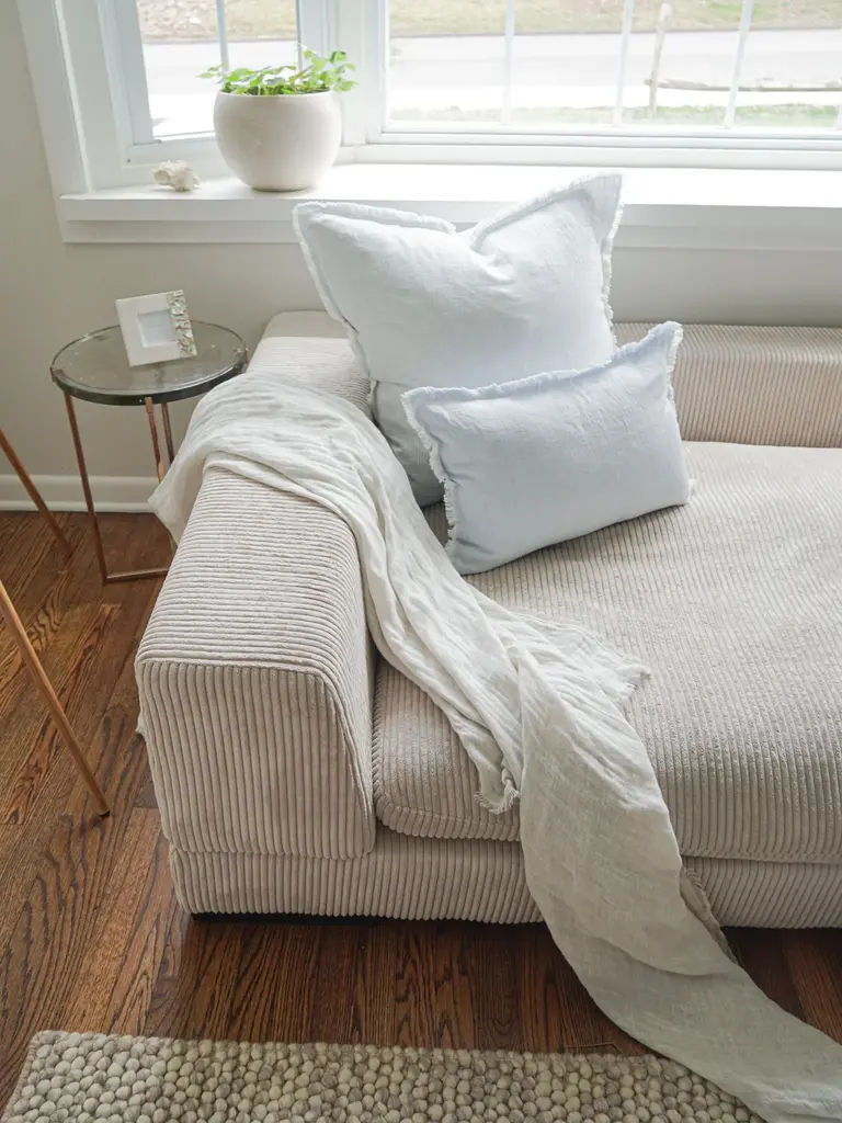The Sky Blue Fringe Soft Linen Pillow is Soo soft- you won’t believe it's linen! This yarn has a slight nub which gives it a beautiful natural texture. Edges have a self-fringe on all sides. Details Front & Back Color: Sky Blue Front & Back side: 100% Linen (Pre-washed) Concealed zipper closure on back side. Hand washing or a delicate cycle with like colored fabrics recommended. Hang to Dry. Made in India. Pillows are available in 3 options:Pillow Cover Only, with a Down Alternative insert, or with a Down InsertDown Alternative InsertBenefits: Allergen free, Better back support, Retain their shapeInside Fill: 1.2 denier x1.25" polyester gelOuter Shell: 65% polyester/ 35% white cotton blendMade in the USA Down InsertBenefits: Durable, Easy to fluff and re-style, Retains heatInside Fill: 95% gray duck feathers and 5% goose downOuter Shell: 233-thread count 100% cotton fabric Made in the USA