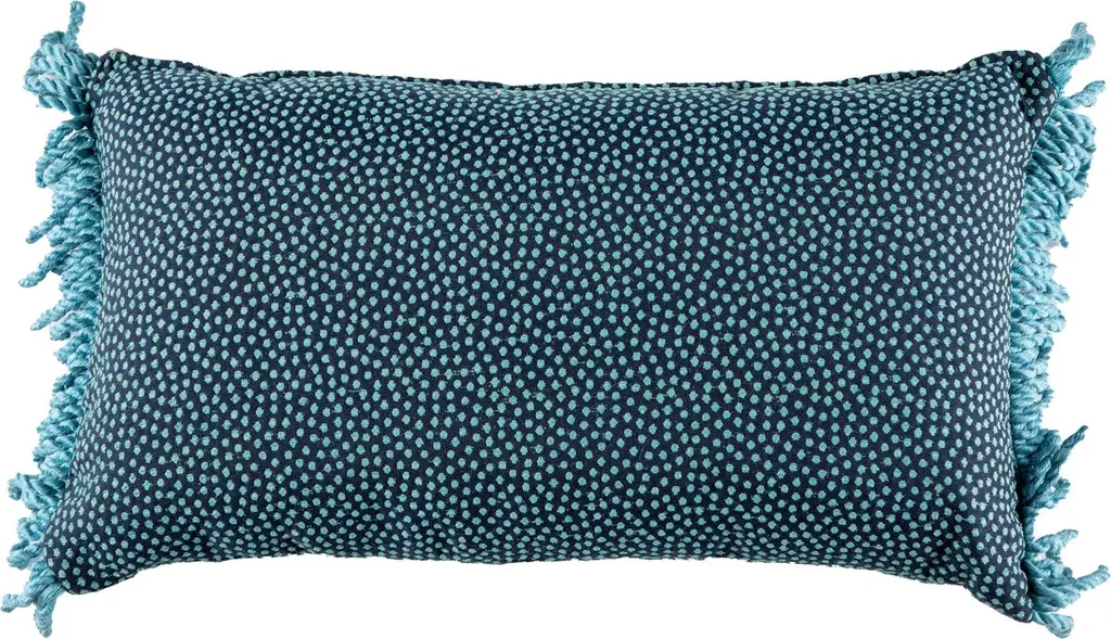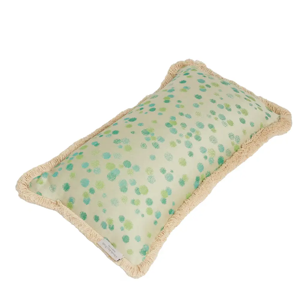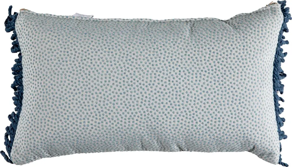 Small luxury decorative cushion in light blue and brown 30x50cm in 100% cotton jacquard fabric with frayed edge. Its exclusive textile pattern is reminiscent of the traditional Apulian macchiato technique, emblematic of the brand as a celebration of the joyful spontaneity of nature. This refined cushion is made entirely by hand in Italy and woven on the ancient looms of a historic Apulian weaving mill with respect for history, nature, and people.