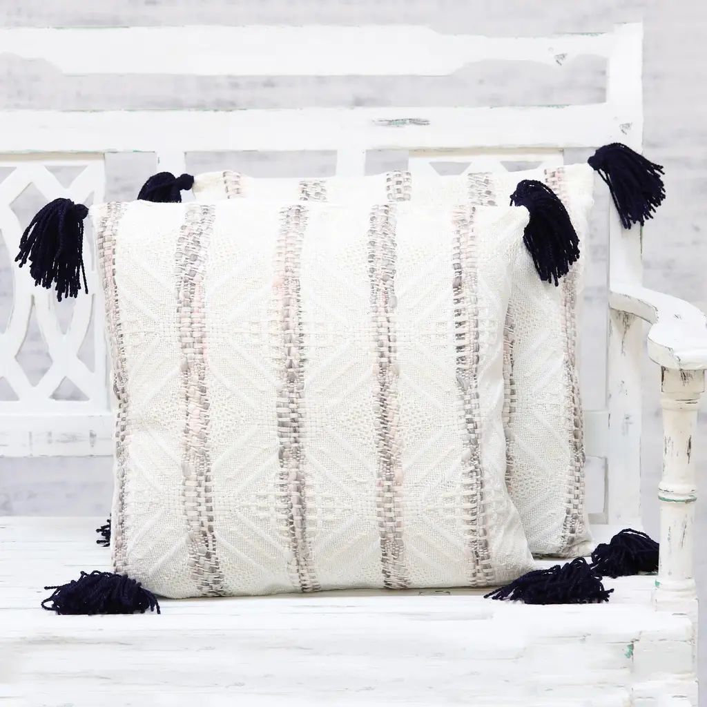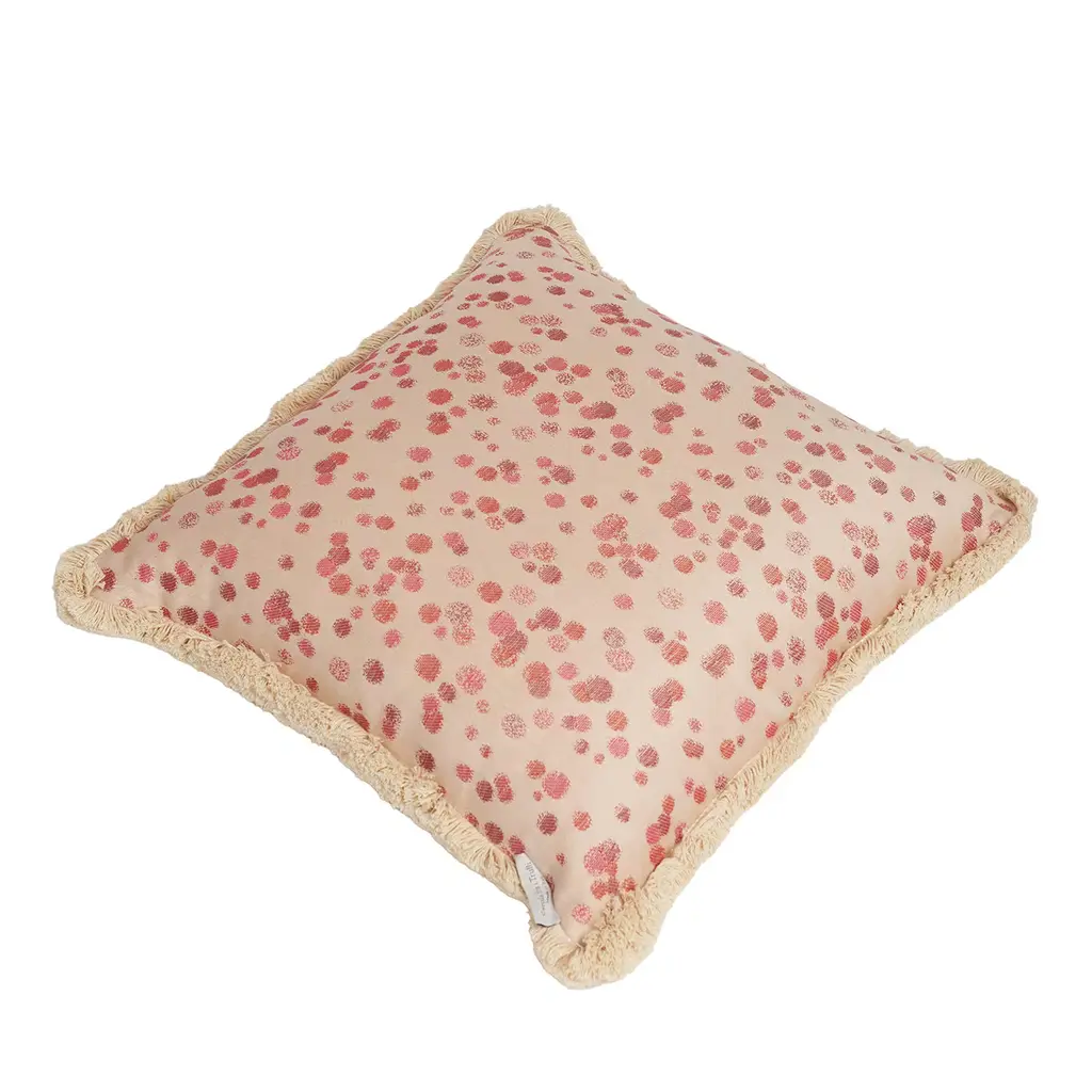 Small luxury decorative cushion in fuchsia and red 30x50cm in 100% cotton jacquard fabric with frayed edge. Its exclusive textile pattern is reminiscent of the traditional Apulian macchiato technique, emblematic of the brand as a celebration of the joyful spontaneity of nature. This refined cushion is made entirely by hand in Italy and woven on the ancient looms of a historic Apulian weaving mill with respect for history, nature, and people.
