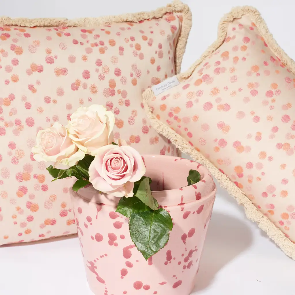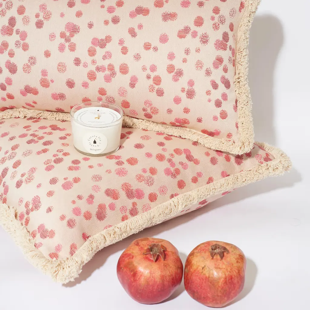 Small luxury decorative cushion in Rose and Coral 30x50cm in 100% cotton jacquard fabric with frayed edge. Its exclusive textile pattern is reminiscent of the traditional Apulian macchiato technique, emblematic of the brand as a celebration of the joyful spontaneity of nature. This refined cushion is made entirely by hand in Italy and woven on the ancient looms of a historic Apulian weaving mill with respect for history, nature, and people