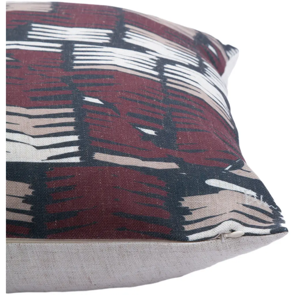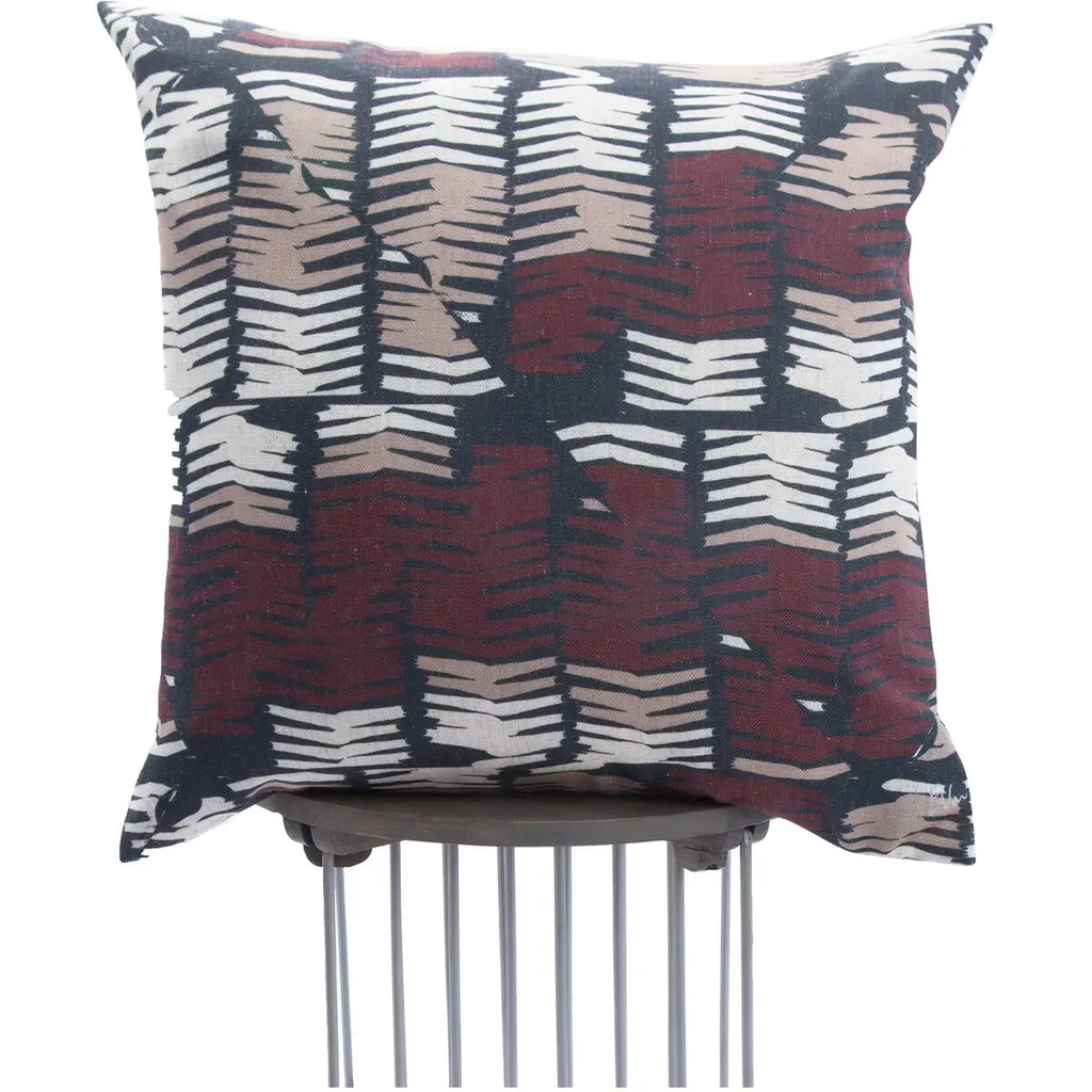 Compose a chic pillowscape on couches and beds with the traditional style of this decorative pillow. Printed in graphic detail on a square pillowcase, freehand chevron stripes of burgundy red, ivory and beige form an exotic bohemian pattern that turns an ordinary cushion into a captivating work of art. A sumptuous combination of duck feathers and down fill the standard pillow sham with enduring softness, offering comfortable cushioning for every seating or sleeping arrangement.