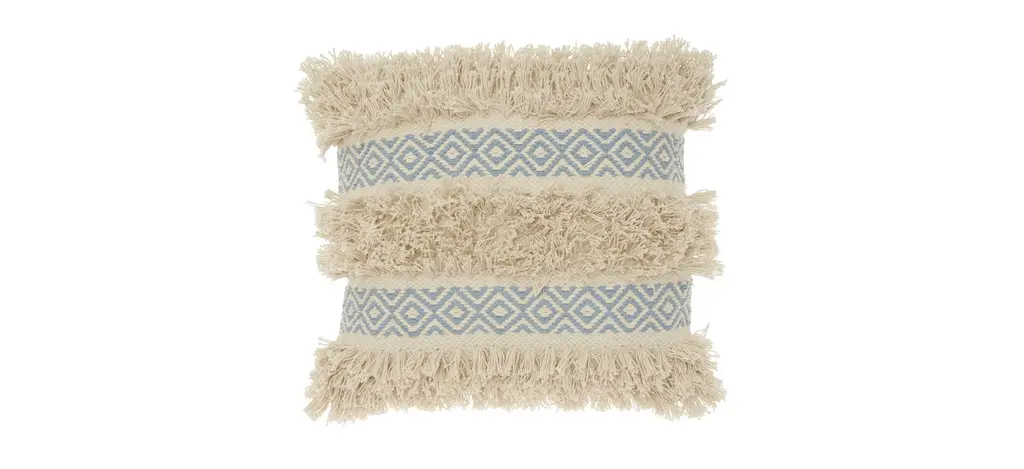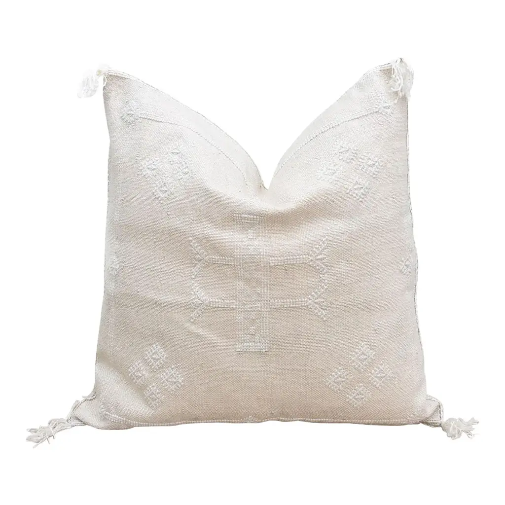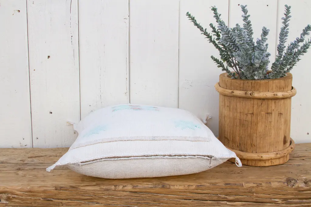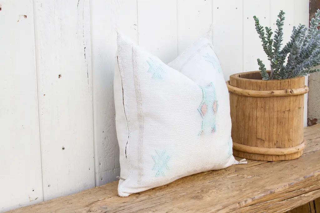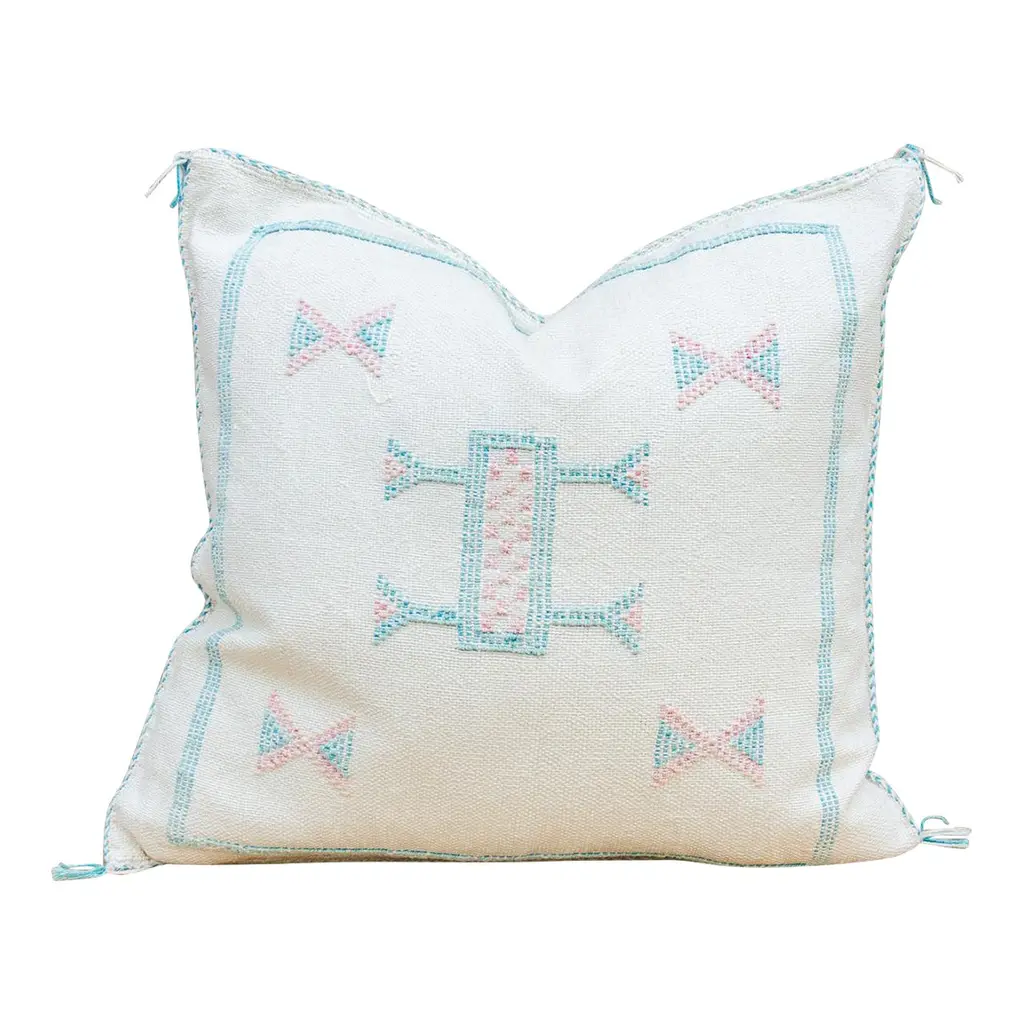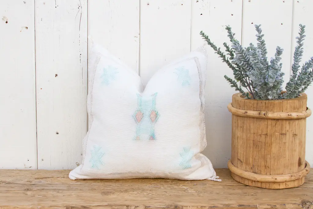 This gorgeous pillow is entirely hand-woven from silk that comes from a Sabra cactus plant. Every pillow is beautifully embroidered with a unique tribal motif that varies from every other pillow. Each pillow is dyed using vegetable dye using a special hand dying technique that gives each one their own lovely faded and beautifully aged colors. This pillow has a zipper closure, down blend insert is included.