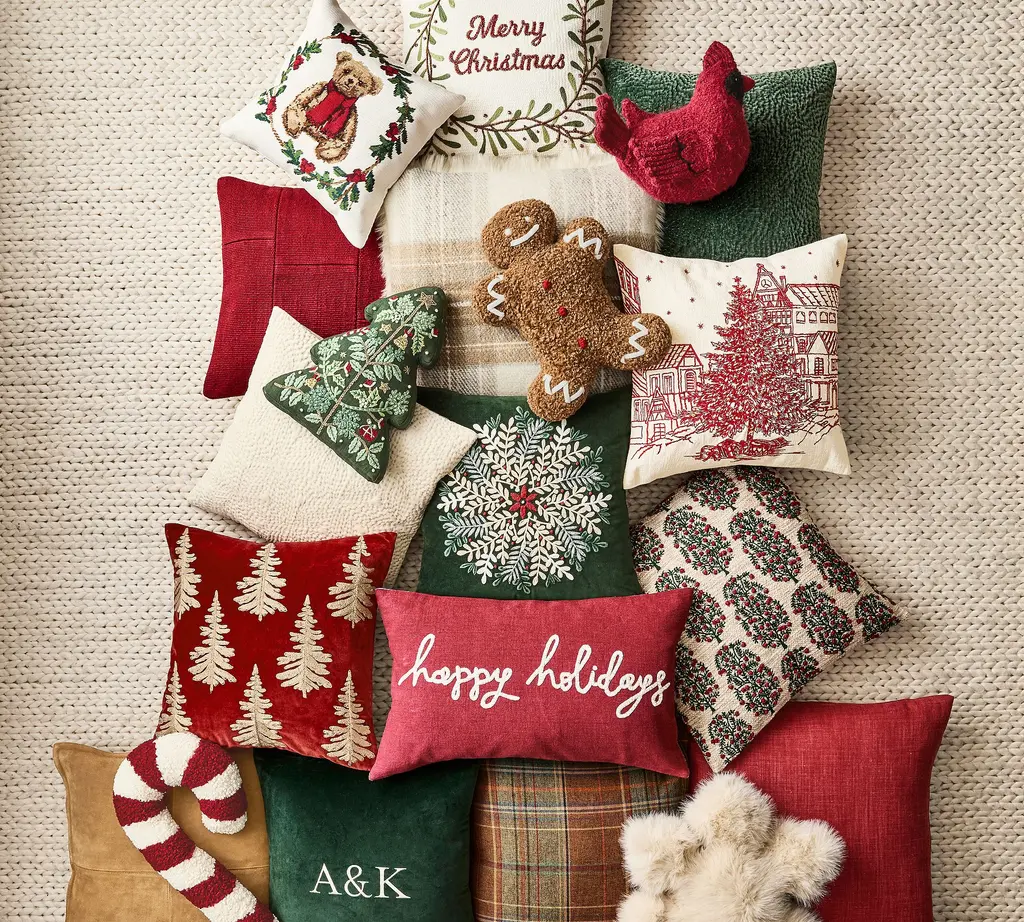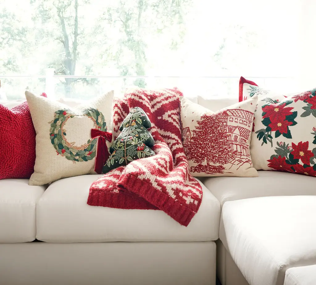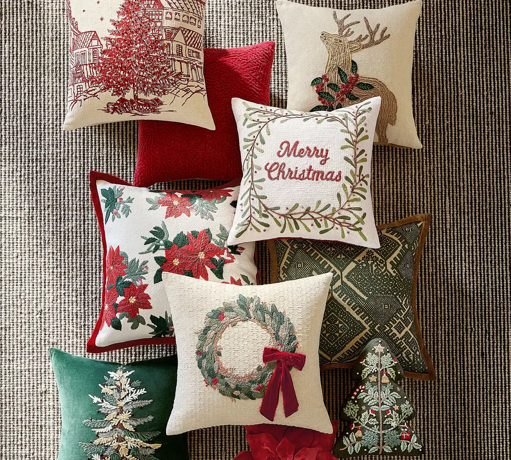 Snowy Village Embroidered Pillow