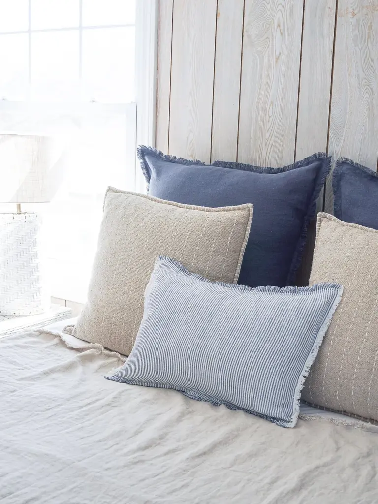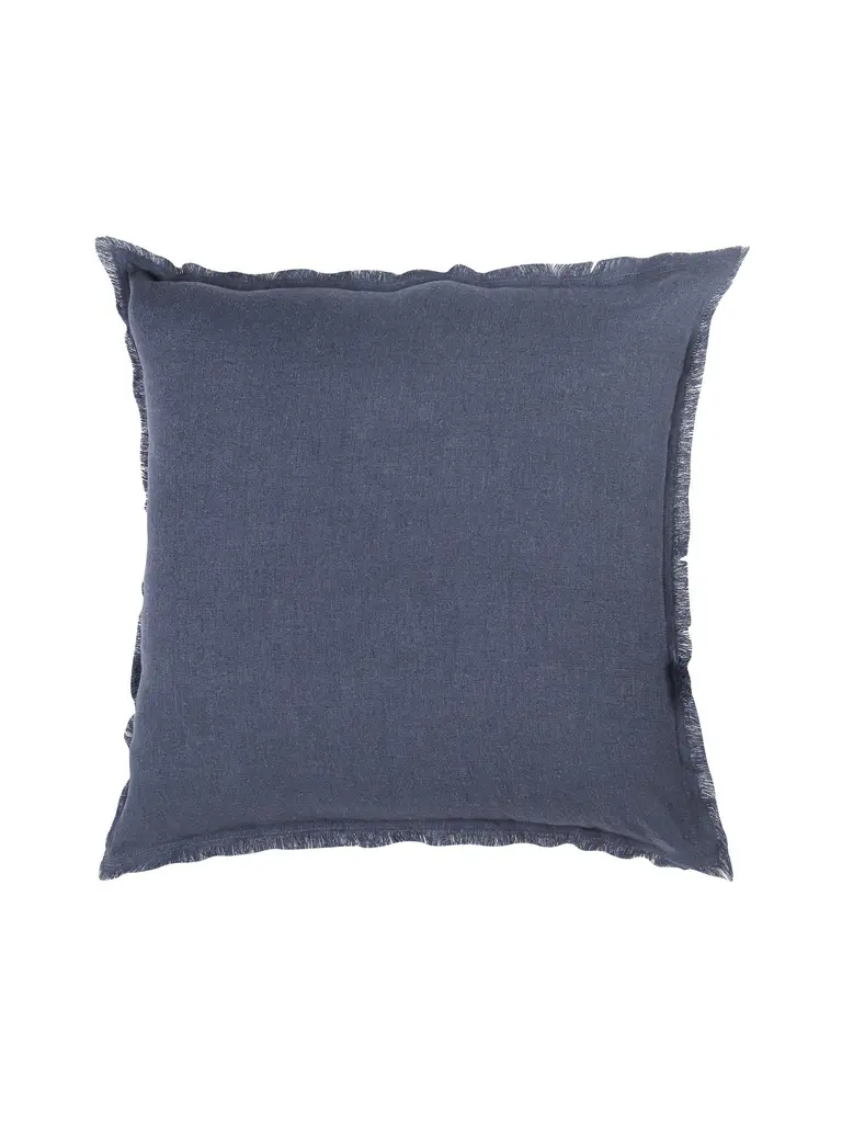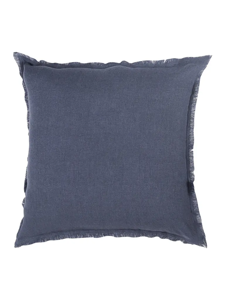 The So Soft Navy Blue Fringe Linen Pillow is Soo soft- you won’t believe it's 100% linen! This yarn has a slight nub which gives it a beautiful natural texture. Edges have a self-fringe on all sides. Details Front & Back Color: Navy Blue Front & Back side: 100% Linen (washed) Concealed zipper closure on back side. Hand washing or a delicate cycle with like colored fabrics recommended. Hang to Dry. Made in India. Pillows are available in 3 options:Pillow Cover Only, with a Down Alternative insert, or with a Down InsertDown Alternative InsertBenefits: Allergen free, Better back support, Retain their shapeInside Fill: 1.2 denier x1.25" polyester gelOuter Shell: 65% polyester/ 35% white cotton blendMade in the USA Down InsertBenefits: Durable, Easy to fluff and re-style, Retains heatInside Fill: 95% gray duck feathers and 5% goose downOuter Shell: 233-thread count 100% cotton fabric Made in the USA