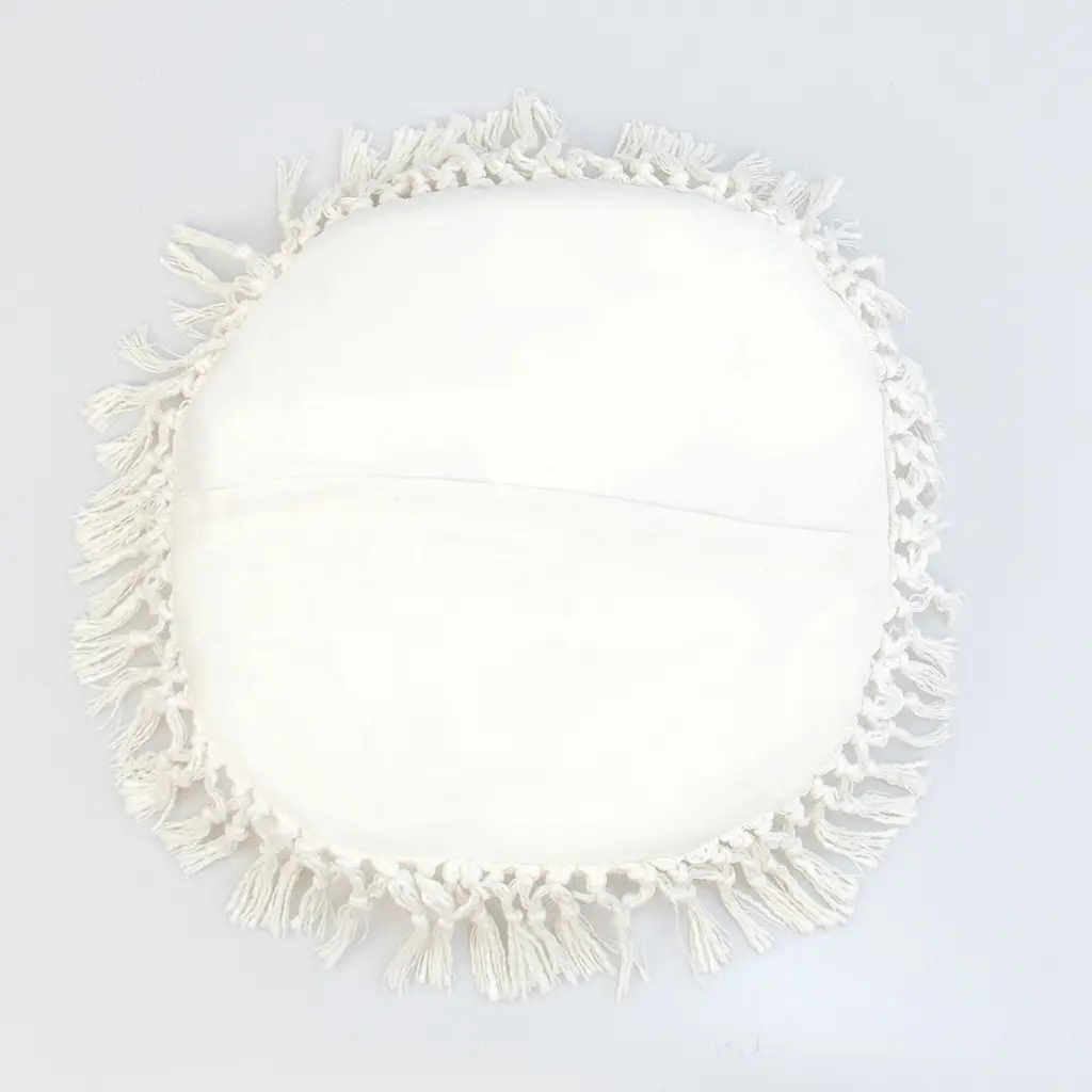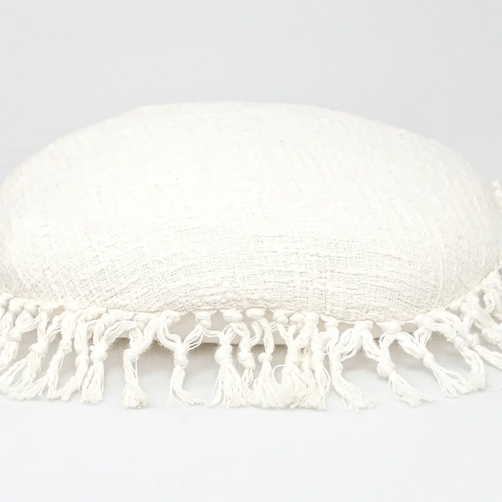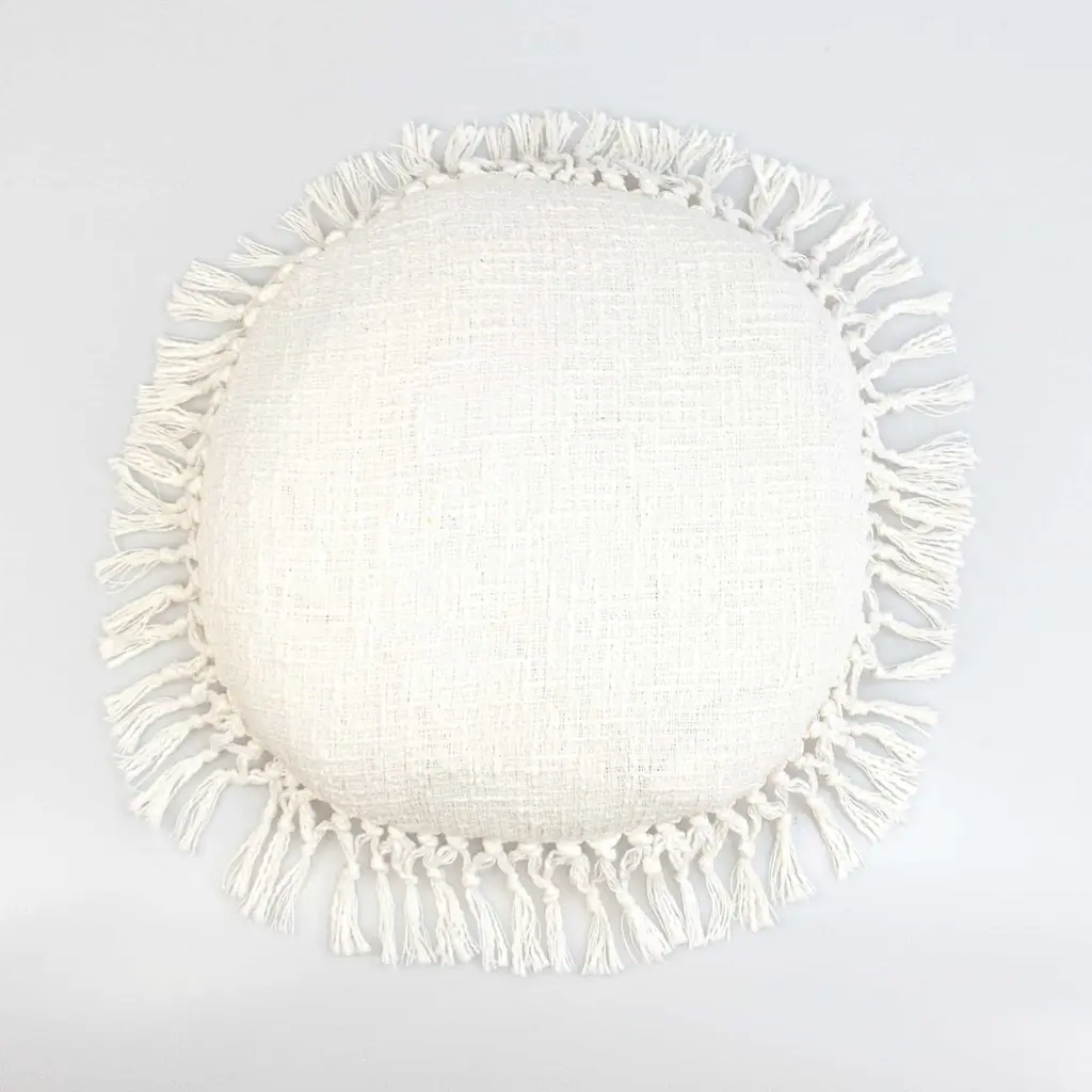 Add charm and comfort to your home with this cream round tassel pillow, perfect for neutral or farmhouse décor. Whether placed in the living room, playroom, or on a favorite chair, it effortlessly enhances any space. Use it as a stylish accent or a cozy floor pillow for extra seating. The soft cotton fabric and delicate tassel details make it a beautiful blend of style and comfort. Product Features: White round throw pillow Removable cover with zipper closure for easy cleaning Accented with tassels around the sides For indoor use only Care instructions: spot clean only Dimensions: 18" diameter x 7" deep Material(s): Shell: cotton Filling: polyester
