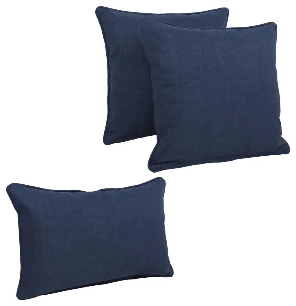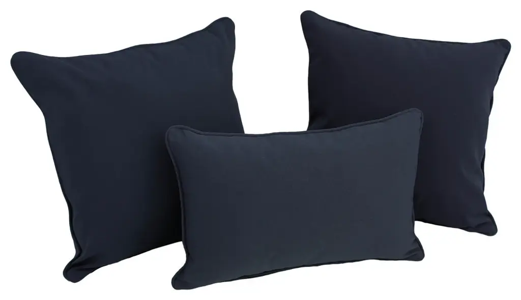 Product Details:Please refer to second image for colorAdd a splash of striking color and classic comfort to your indoor furnishings with these throw pillows. These throw pillows feature a classic corded design, include a blown microdenier polyester filled insert for easy cleaning, and are covered in soft premium twill fabric available in twenty-two beautiful color varietiesIncludes: One (1) Back Support Pillows, Two (2) Throw PillowsDimensions: Back Support Pillows: 20 inches wide x 12 inches deep x 7 inches high, Throw Pillows: 18 inches wide x 18 inches deep x 8 inches highBrowse Color Name: BlueFabric Type: 100% Polyester
