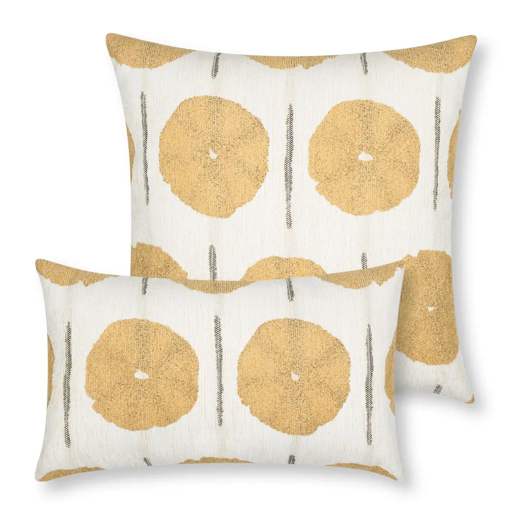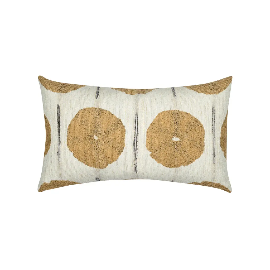 Add a touch of modern art and metallic glamour to your outdoor space with the Solstice Outdoor Pillow from Elaine Smith. Featuring organic circles and painterly lines, the rich colors and soft, natural texture create a striking and elevated design. Ideal for both indoor and outdoor spaces, this durable and soft pillow is an effortless accent in any environment. Highlights