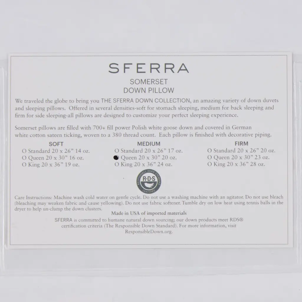 The SFERRA Somerset down pillow is designed to cocoon you in sweet dreams. Carefully constructed of down clusters, which interlock and trap air to keep you warm, but also have the remarkable ability to keep you comfortable, SFERRA down offers varying levels of fill power to customize the perfect sleeping experience. A measure of efficiency, the higher the fill power number, the better the down and the greater its insulating value. With a weight and a loft for everyone, one will be just right for you.