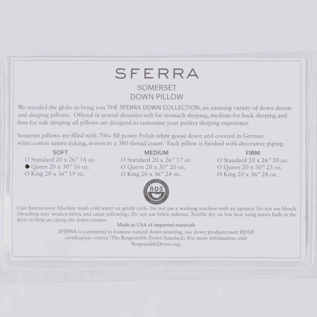 The SFERRA Somerset down pillow is designed to cocoon you in sweet dreams. Carefully constructed of down clusters, which interlock and trap air to keep you warm, but also have the remarkable ability to keep you comfortable, SFERRA down offers varying levels of fill power to customize the perfect sleeping experience. A measure of efficiency, the higher the fill power number, the better the down and the greater its insulating value. With a weight and a loft for everyone, one will be just right for you.