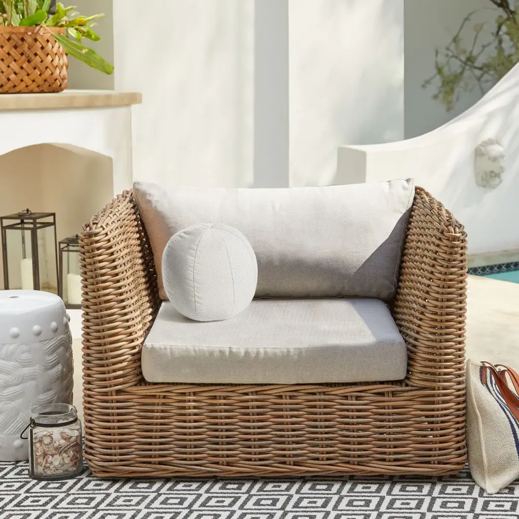 Elevate your outdoor space with this modern, unexpected ivory ball pillow. This pillow is sure to add comfort and style to any sized space when paired with other shapes and colors. From poolside to patio, this pillow brings that personal touch you''ve been hunting for. Expertly crafted in North America, this pillow is designed with quality in mind, so all you have to do is sit back and relax! • Ideal for casual indoor and outdoor use• Includes one (1) pillow• • • Pillow only. Furniture not included.• • Made in North America•