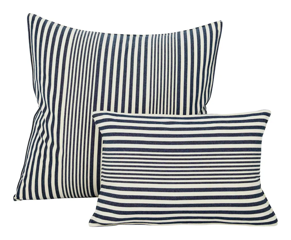 Step out on your porch or patio and start brightening it up with this adorable set of two square pillows! Featuring a beautiful stripe fabric in a rich, blue hue, this pillow set is sure to add style to your space and help you enjoy the outdoors so much more! Crafted out of a performance material right here in North America, these pillows are made to withstand the sun, rain and even stains so that all you have to do is sit back and relax! Sunbrella is founded on the belief that fabrics should be both beautiful and functional. We began in the 1960s with the challenge of creating an awning canvas with a substantially longer lifespan than cotton. Sunbrella has become widely adopted for shade structures, marine canvas and upholstery fabric for both outdoor and indoor applications.Our textiles are made with close attention to design detail, and engineered with robust performance characteristics that provide resistance to fading and degradation from sunlight and chemical exposure. The fabric is tactile yet durable, has industry-leading environmental characteristics, is easy to care for and offers long life wherever it''s used.No Sunbrella manufacturing facility in the world sends waste to landfills. A result of our focus on efficiency, this monumental achievement allows Sunbrella to lead by example, putting sustainability into practice every day across the globe. Our unique coloring process not only makes Sunbrella fabrics fade-resistant, it also conserves more water than conventional dyeing processes. At Sunbrella we believe it''s important to preserve the environment around our facilities. We work to conserve the plant and animal life that is native to the area and encourage our employees to plant gardens designed to provide fresh food and nourish local wildlife.We stand behind our fabrics with a guarantee that''s the best in the industry: a 5-year limited warranty for upholstery. This warranty protects the original purchaser of Sunbrella fabric. This warranty protects against Sunbrella fabric becoming unserviceable due to color or strength loss from normal usage and exposure conditions, including sunlight, mildew and atmospheric chemicals.• Ideal for casual indoor and outdoor use• Includes two (2) square pillows• • Available in 16 in, 18 in, 20 in, 22 in, and 24 in sizes• Pillows only. Furniture not included.• • Made in North America•
