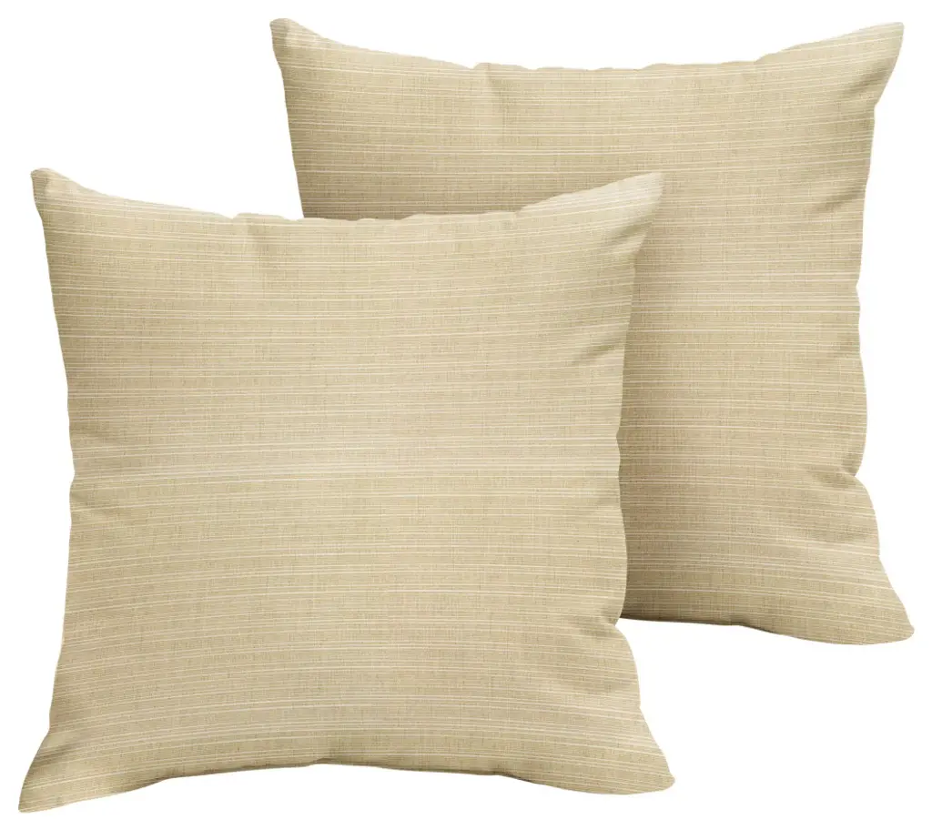 Step out on your porch or patio and start brightening it up with this adorable set of two square pillows! Featuring a beautiful solid textured fabric in a rich, tan hue, this pillow set is sure to add style to your space and help you enjoy the outdoors so much more! Crafted out of a performance material right here in North America, these pillows are made to withstand the sun, rain and even stains so that all you have to do is sit back and relax! Sunbrella is founded on the belief that fabrics should be both beautiful and functional. We began in the 1960s with the challenge of creating an awning canvas with a substantially longer lifespan than cotton. Sunbrella has become widely adopted for shade structures, marine canvas and upholstery fabric for both outdoor and indoor applications.Our textiles are made with close attention to design detail, and engineered with robust performance characteristics that provide resistance to fading and degradation from sunlight and chemical exposure. The fabric is tactile yet durable, has industry-leading environmental characteristics, is easy to care for and offers long life wherever it''s used.No Sunbrella manufacturing facility in the world sends waste to landfills. A result of our focus on efficiency, this monumental achievement allows Sunbrella to lead by example, putting sustainability into practice every day across the globe. Our unique coloring process not only makes Sunbrella fabrics fade-resistant, it also conserves more water than conventional dyeing processes. At Sunbrella we believe it''s important to preserve the environment around our facilities. We work to conserve the plant and animal life that is native to the area and encourage our employees to plant gardens designed to provide fresh food and nourish local wildlife.We stand behind our fabrics with a guarantee that''s the best in the industry: a 5-year limited warranty for upholstery. This warranty protects the original purchaser of Sunbrella fabric. This warranty protects against Sunbrella fabric becoming unserviceable due to color or strength loss from normal usage and exposure conditions, including sunlight, mildew and atmospheric chemicals.• Ideal for casual indoor and outdoor use• Includes two (2) square pillows• • Available in 16 inch and 20 inch sizes• Pillows only. Furniture not included.• • Made in North America•