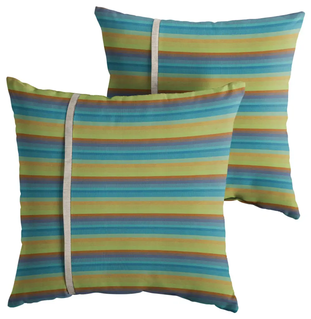 Step out on your porch or patio and start brightening it up with this adorable set of two square pillows! Featuring a beautiful stripe fabric in a rich, multi color hue, this pillow set is sure to add style to your space and help you enjoy the outdoors so much more! Crafted out of a performance material right here in North America, these pillows are made to withstand the sun, rain and even stains so that all you have to do is sit back and relax! Sunbrella is founded on the belief that fabrics should be both beautiful and functional. We began in the 1960s with the challenge of creating an awning canvas with a substantially longer lifespan than cotton. Sunbrella has become widely adopted for shade structures, marine canvas and upholstery fabric for both outdoor and indoor applications.Our textiles are made with close attention to design detail, and engineered with robust performance characteristics that provide resistance to fading and degradation from sunlight and chemical exposure. The fabric is tactile yet durable, has industry-leading environmental characteristics, is easy to care for and offers long life wherever it''s used.No Sunbrella manufacturing facility in the world sends waste to landfills. A result of our focus on efficiency, this monumental achievement allows Sunbrella to lead by example, putting sustainability into practice every day across the globe. Our unique coloring process not only makes Sunbrella fabrics fade-resistant, it also conserves more water than conventional dyeing processes. At Sunbrella we believe it''s important to preserve the environment around our facilities. We work to conserve the plant and animal life that is native to the area and encourage our employees to plant gardens designed to provide fresh food and nourish local wildlife.We stand behind our fabrics with a guarantee that''s the best in the industry: a 5-year limited warranty for upholstery. This warranty protects the original purchaser of Sunbrella fabric. This warranty protects against Sunbrella fabric becoming unserviceable due to color or strength loss from normal usage and exposure conditions, including sunlight, mildew and atmospheric chemicals.• Ideal for casual indoor and outdoor use• Includes two (2) square pillows• • Available in 18 inch and 22 inch sizes• • • Made in North America•