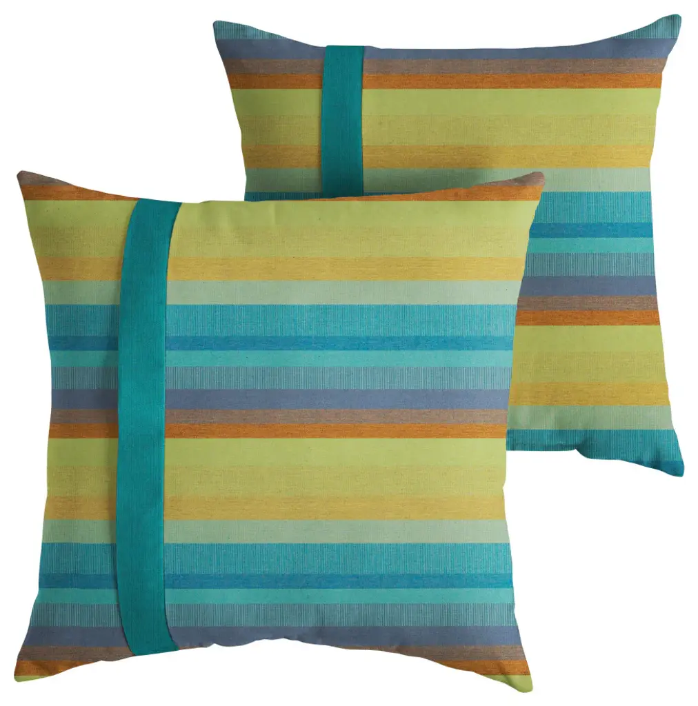 Step out on your porch or patio and start brightening it up with this adorable set of two square pillows! Featuring a beautiful stripe fabric in a rich, blue hue, this pillow set is sure to add style to your space and help you enjoy the outdoors so much more! Crafted out of a performance material right here in North America, these pillows are made to withstand the sun, rain and even stains so that all you have to do is sit back and relax! Sunbrella is founded on the belief that fabrics should be both beautiful and functional. We began in the 1960s with the challenge of creating an awning canvas with a substantially longer lifespan than cotton. Sunbrella has become widely adopted for shade structures, marine canvas and upholstery fabric for both outdoor and indoor applications.Our textiles are made with close attention to design detail, and engineered with robust performance characteristics that provide resistance to fading and degradation from sunlight and chemical exposure. The fabric is tactile yet durable, has industry-leading environmental characteristics, is easy to care for and offers long life wherever it''s used.No Sunbrella manufacturing facility in the world sends waste to landfills. A result of our focus on efficiency, this monumental achievement allows Sunbrella to lead by example, putting sustainability into practice every day across the globe. Our unique coloring process not only makes Sunbrella fabrics fade-resistant, it also conserves more water than conventional dyeing processes. At Sunbrella we believe it''s important to preserve the environment around our facilities. We work to conserve the plant and animal life that is native to the area and encourage our employees to plant gardens designed to provide fresh food and nourish local wildlife.We stand behind our fabrics with a guarantee that''s the best in the industry: a 5-year limited warranty for upholstery. This warranty protects the original purchaser of Sunbrella fabric. This warranty protects against Sunbrella fabric becoming unserviceable due to color or strength loss from normal usage and exposure conditions, including sunlight, mildew and atmospheric chemicals.• Ideal for casual indoor and outdoor use• Includes two (2) square pillows• • Available in 18 inch and 22 inch sizes• • • Made in North America•