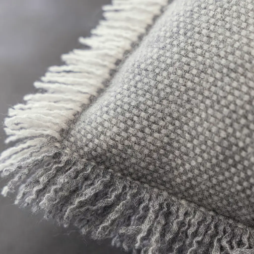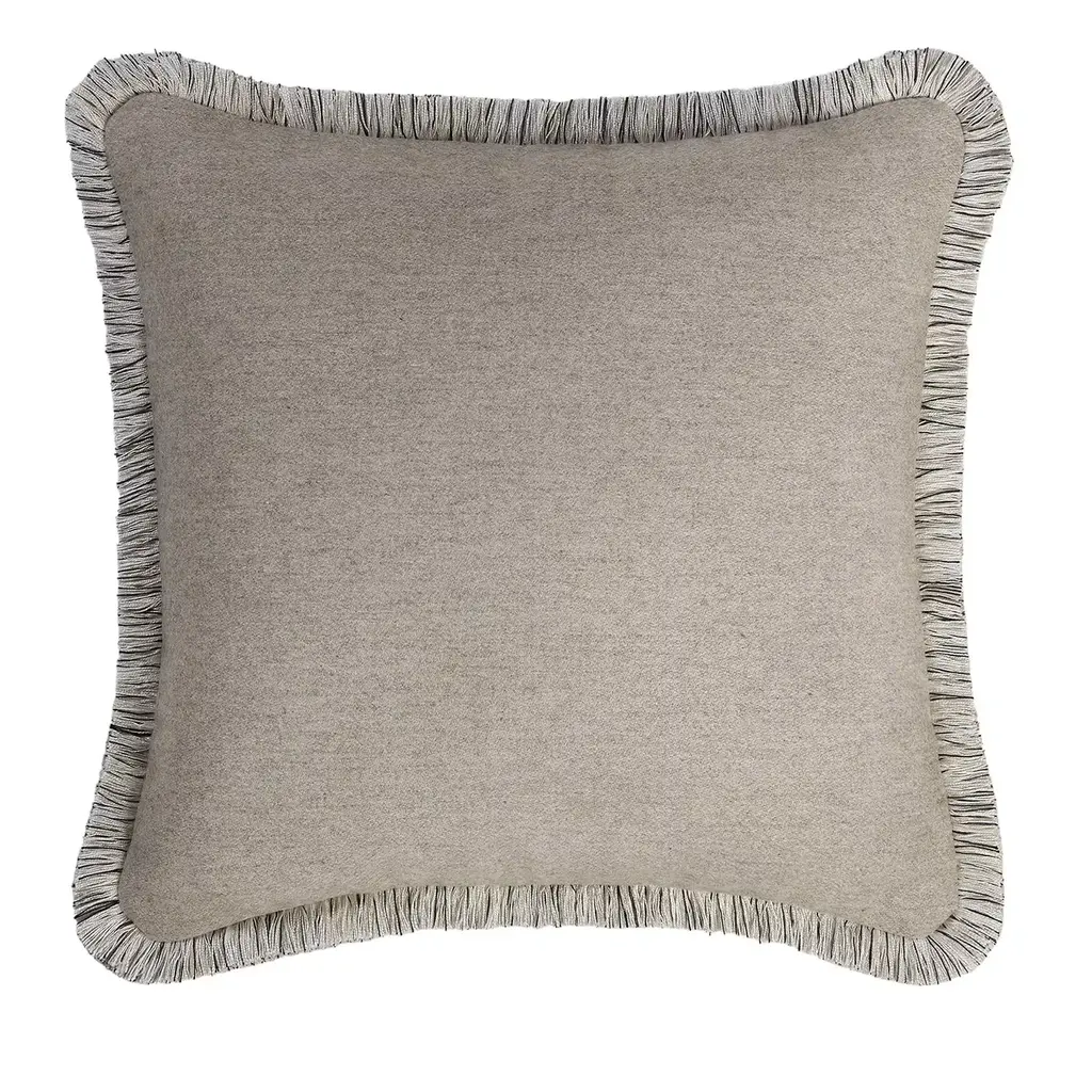 Exemplifying sartorial quality and quiet elegance, this square cushion makes for a refined addition to a bed throw set or sofa in a wide variety of decor styles. The rich inner padding makes it plump, while the gray-toned cashmere upholstery tightly envelops it. The two-tone fringed hems result from a careful artisan process ensuring impeccable quality. Padding included.