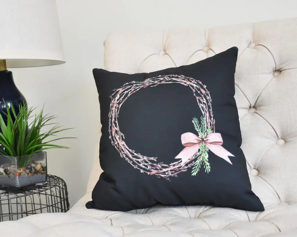 Sprig Of Green 20" Black Holiday Print Decorative Throw Pillow
