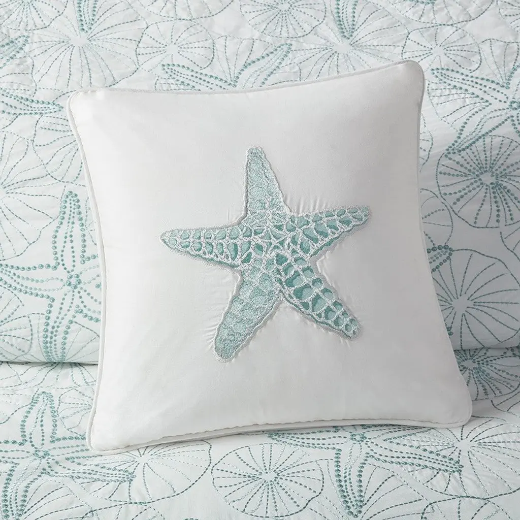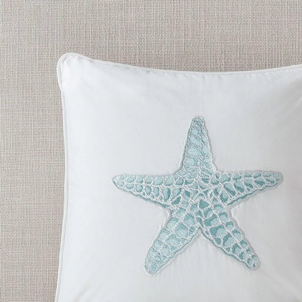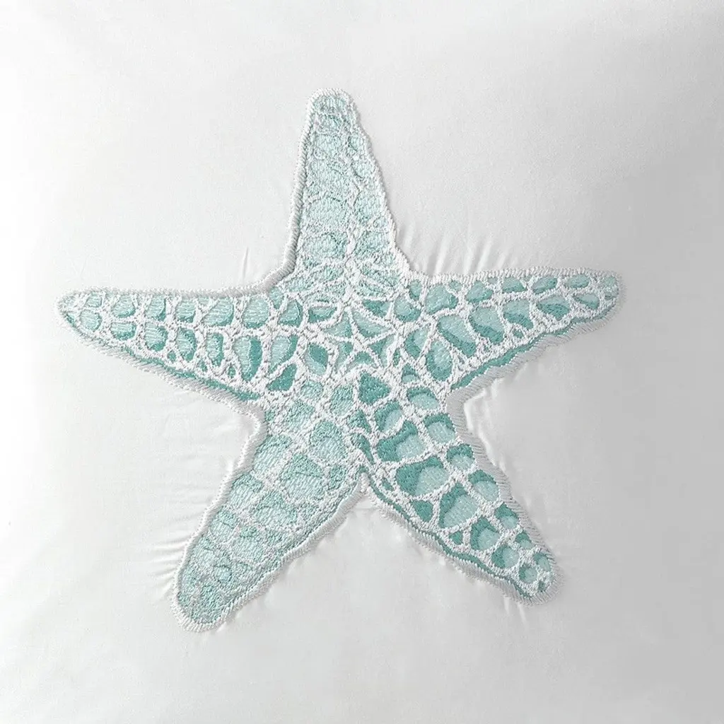 Description Bring the ocean into your home with the Harbor House Maya Bay Collection. This 100% cotton square pillow features a white ground and embroidery on the face creating a seashell that pops off the pillow and is the perfect addition to the Maya Bay bedding set that is sold separately. This item is also OEKO-TEX certified, meaning it does not contain any harmful substances or chemicals, ensuring quality comfort and wellness. Spot clean or dry clean for best care. Product Details 16x16" 1 Pillow:16"W x 16"L Material Fcae: 100% cotton with sea star embroidery Filling: 100% poly