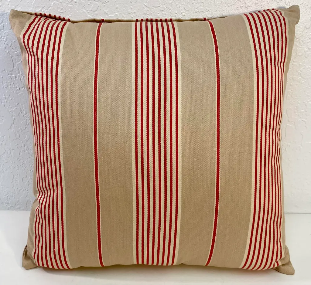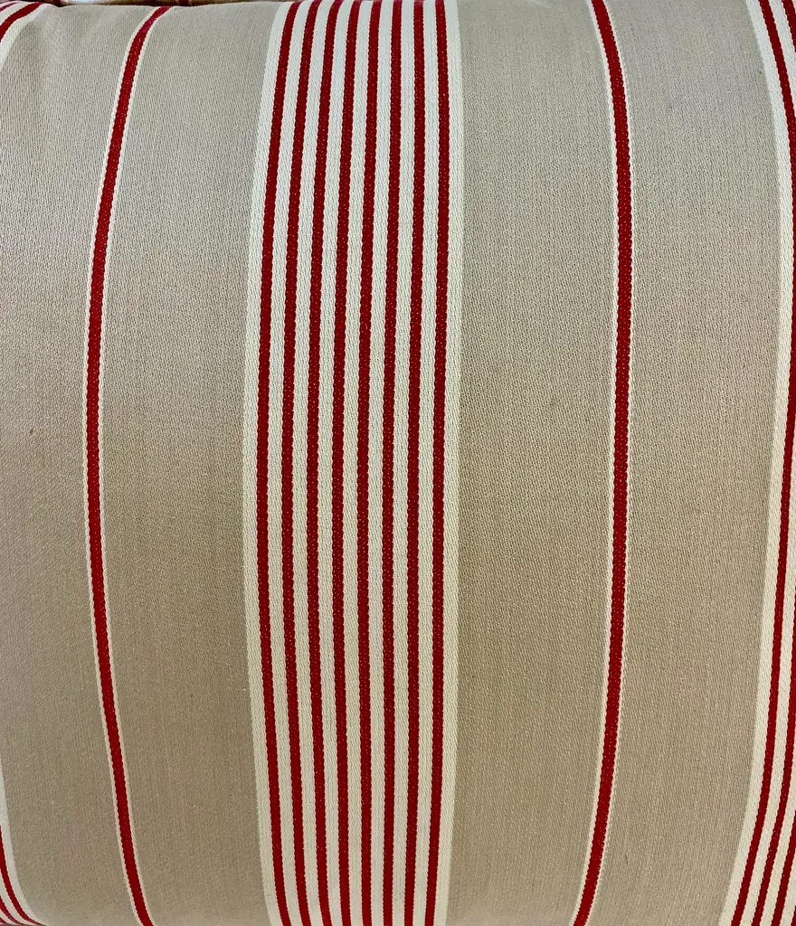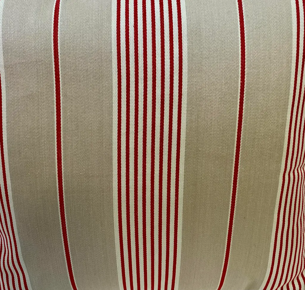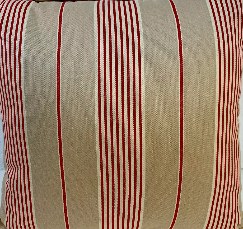 16” Square Red Stripe Pillow - Made in U K. This pillow was made in Wales, U.K., by a small cottage designer/manufacturer owned by a lovely couple. The covers are made from discontinued upholstery material. So, once they are gone, you will not see these pillows again. They are truly unique. Each pillow measures 16” W x" 16" T x 5" D . The fill is larger giving the pillow a full look. Dry clean only. Pillows are sold only with insert. For other designs and sizes, please check our shop here.