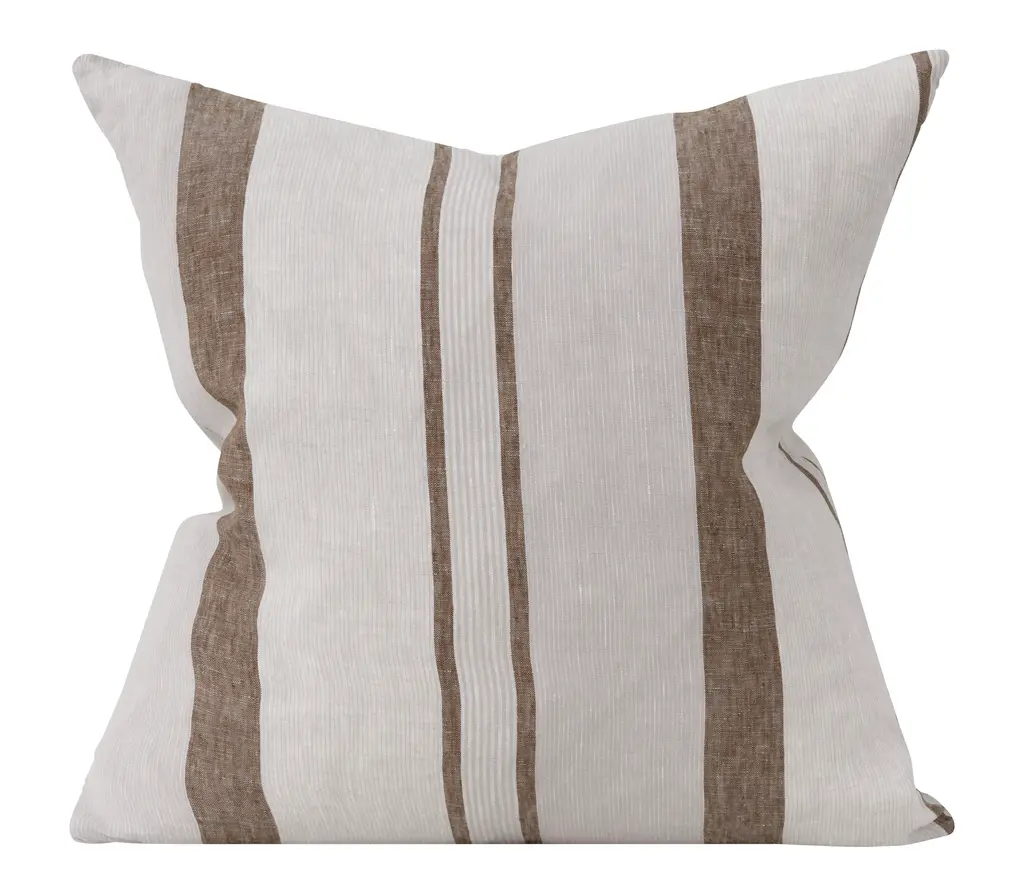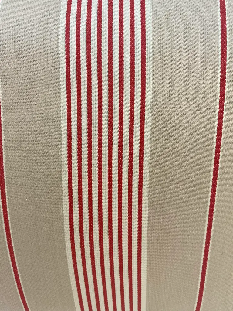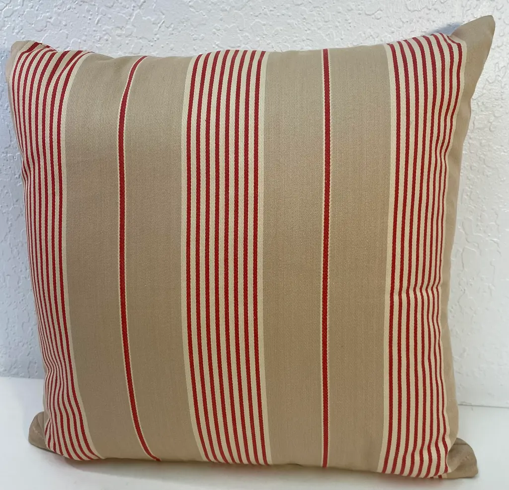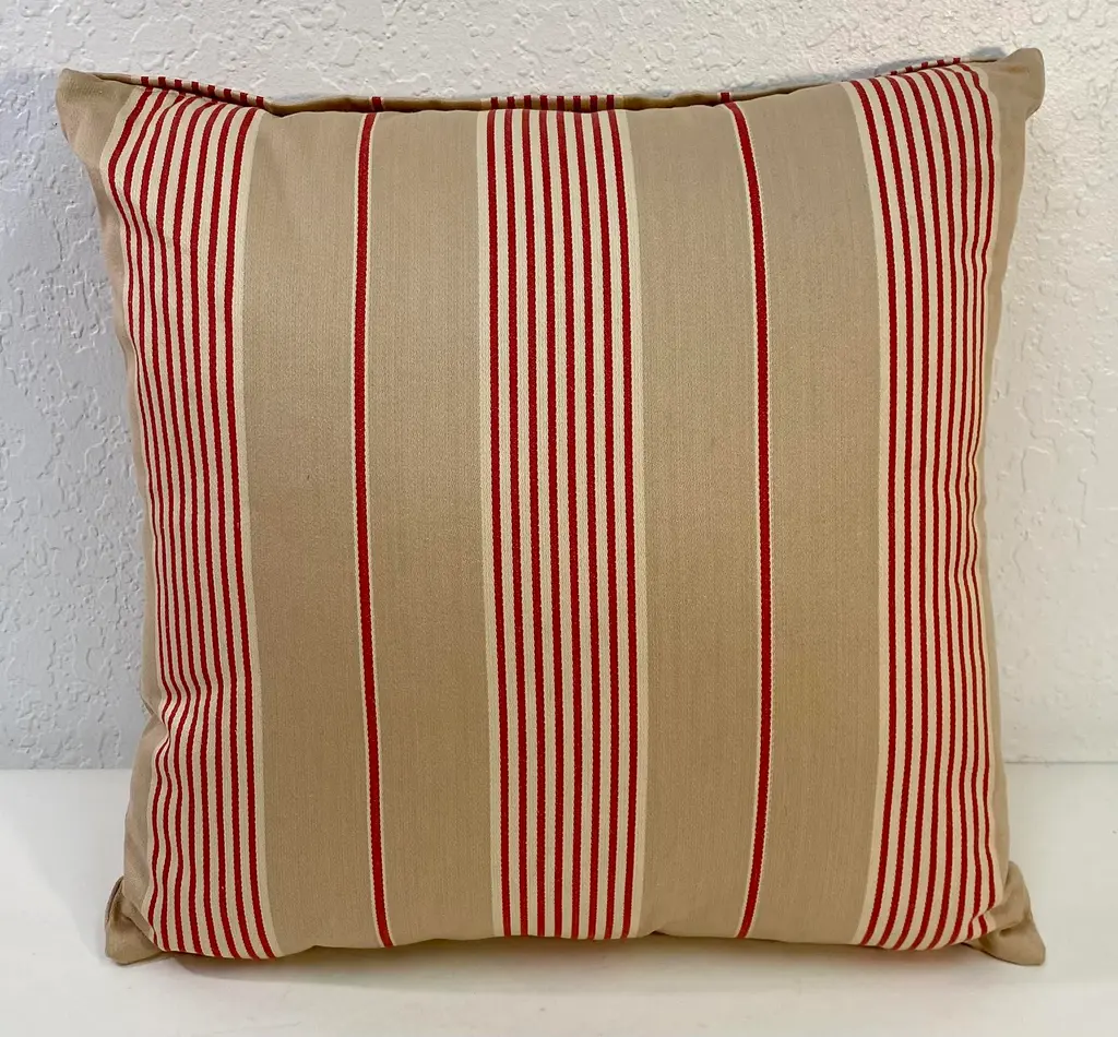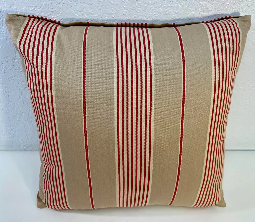 16” Square Red Stripe Pillow - Made in U K. This pillow was made in Wales, U.K., by a small cottage designer/manufacturer owned by a lovely couple. The covers are made from discontinued upholstery material. So, once they are gone, you will not see these pillows again. They are truly unique. Each pillow measures 16” W x" 16" T x 5" D . The fill is larger giving the pillow a full look. Dry clean only. Pillows are sold only with insert. For other designs and sizes, please check our shop here.