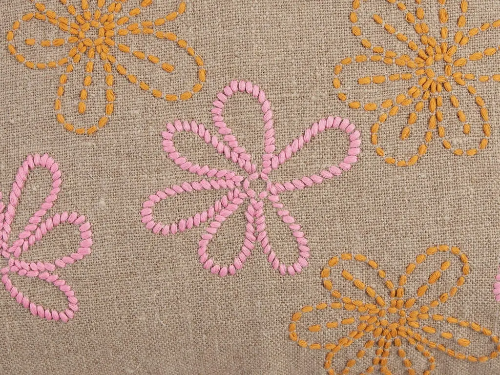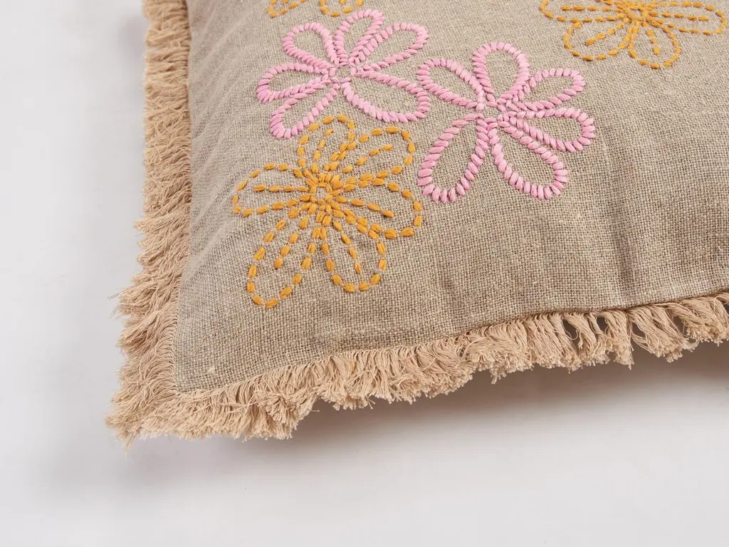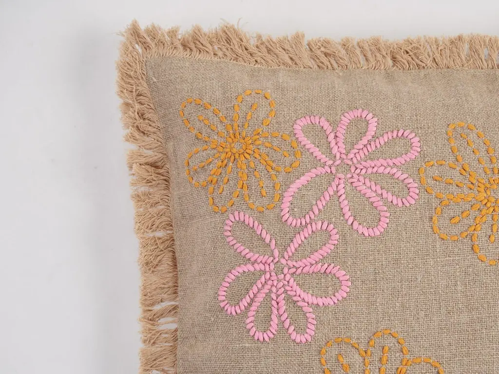 The pink and orange flowers are entirely embroidered by hand on high quality natural linen. A cushion like this, can transform instantly a space.Standard size 50 x 50 cm. Customisable in other sizes and/or colour combinations on request.Based in the Netherlands and India's Uttar Pradesh, Jupe by Jackie is an internationally renowned fashion and interior brand born out of a desire to shine light on the art of hand embroidery: a dying craft in today’s fast-paced fashion industry.